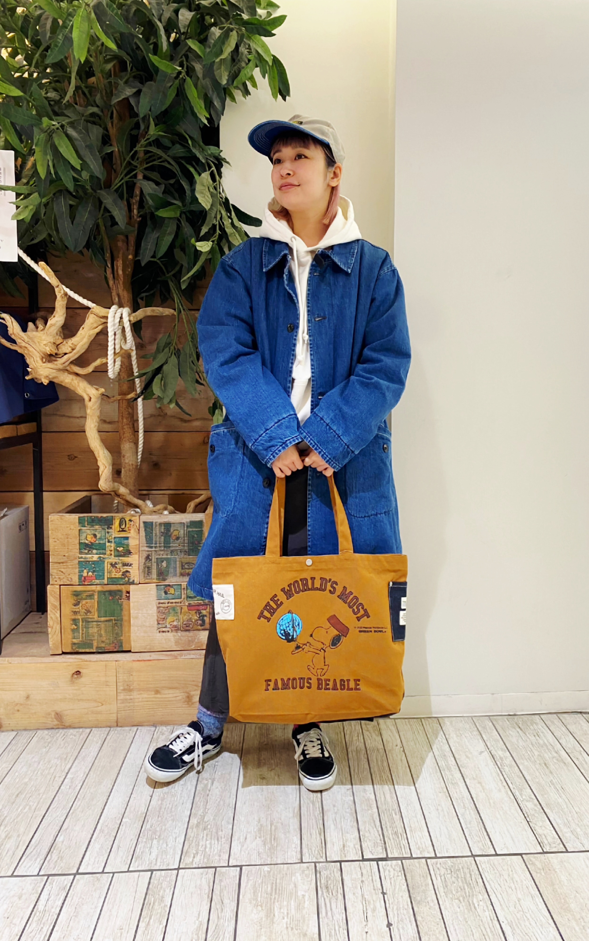 キャップとスヌーピーのトートバッグでよりカジュアルに