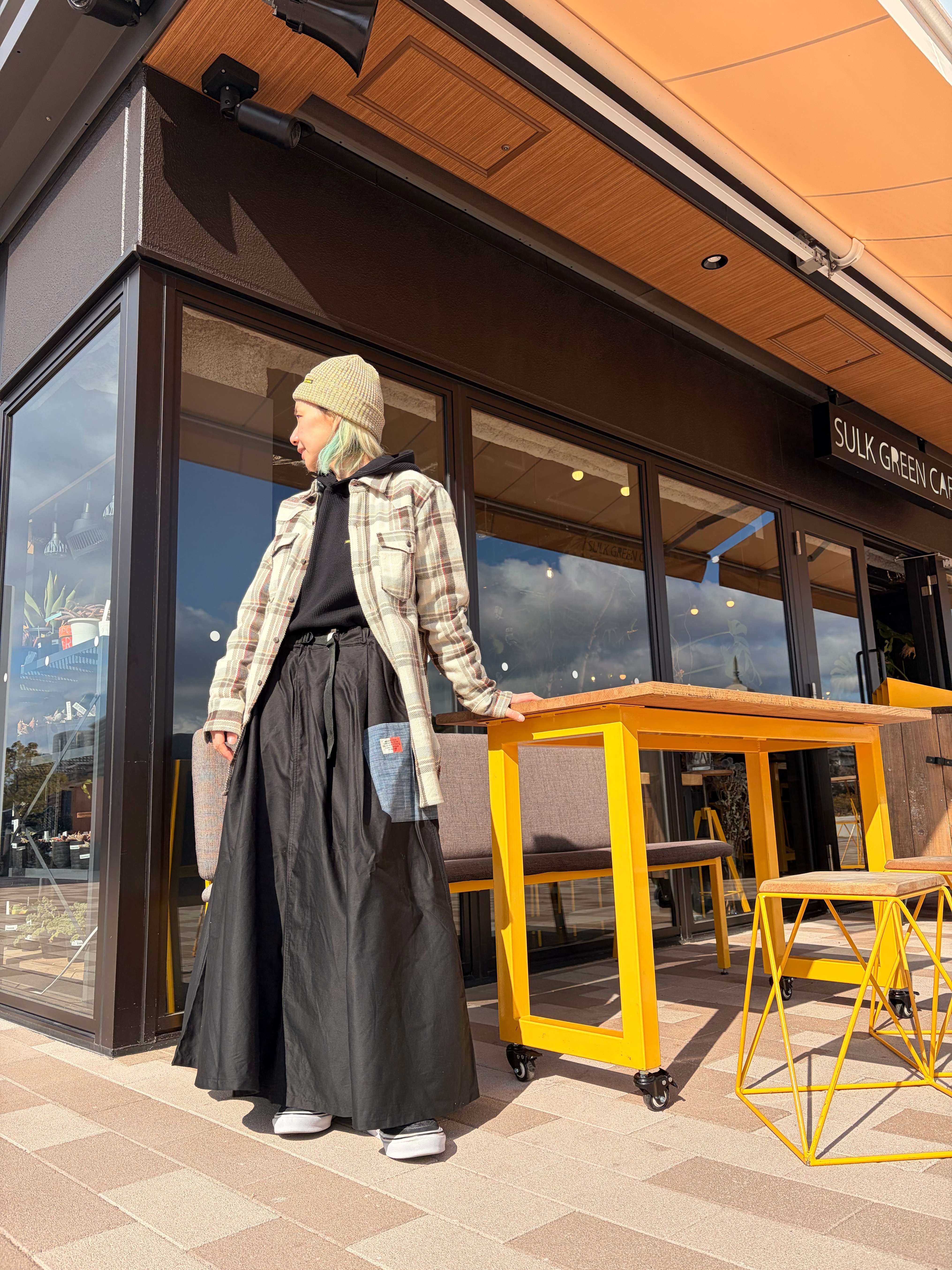 カラーも単色なので合わせやすく、モデルのようにトップスをチェック柄で組みわせる事でメリハリのあるスタイルになりますよ☆