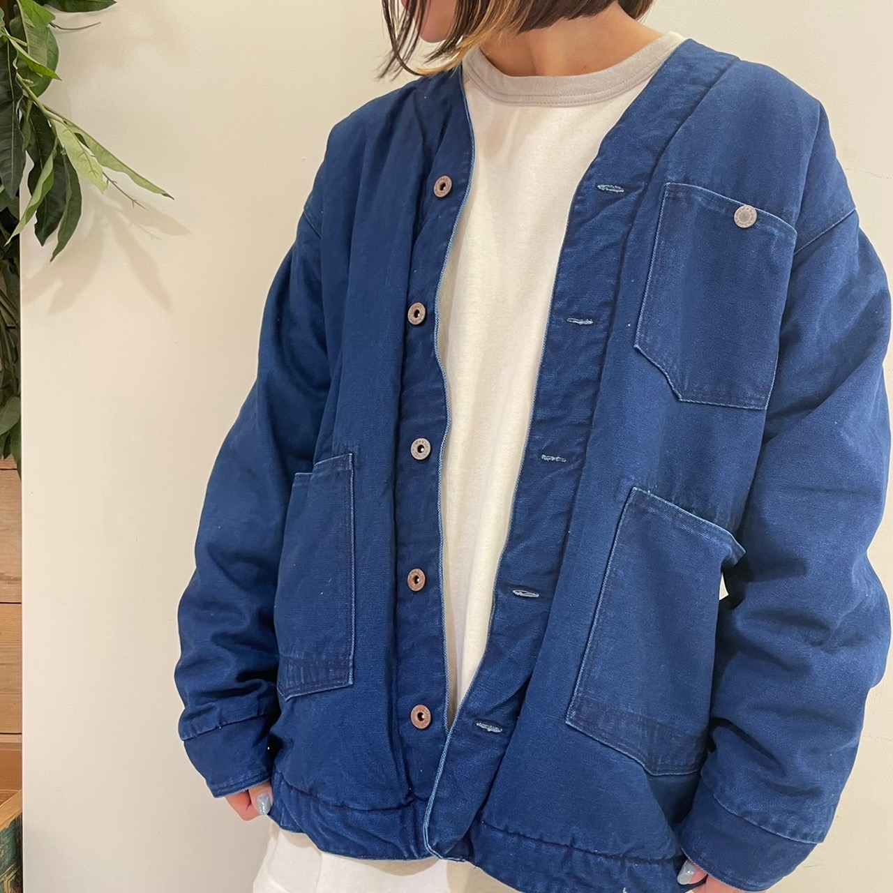 ノーカラータイプのアウターなので、衿があるものと合わせやすいです(´∀`)b