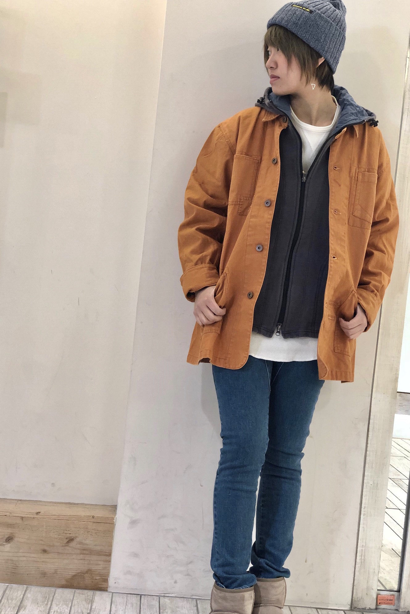 オレンジでアクセントに! 今回は可愛い色合わせのスタイルのご紹介です♪ ダメージカバーオールのオレンジをメインに使ってみました!! 着るのには勇気が…!という方もいらっしゃるかもしれませんが、着てみるとすごく馴染んでくれるんですよ(^ω^) 中のパーカーも落ち着いた色なのでアクセントになってくれています☆ 着ているスタッフも可愛い!と口にしていました☀︎ デニムとの相性も◎なので是非この機会にチェックしてみてください^_−♯