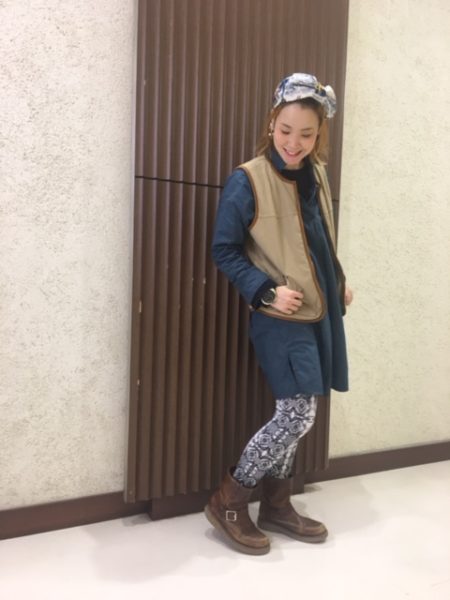 ガーリースタイル♪* 大床さんの珍しいガースタイルです(^_^)/♡ スタッフからも大人気のダック×ボアベストを シャツワンピースに合わせて いつもと違った女の子らしいスタイルに★ しかしベストがメンズライクなデザインなので 可愛すぎず大床さんらしいスタイルになっています(*^_^*) レギンスはビパッチのヨガパンツ♪* 柄も個性的でちょっと人とは違ったスタイルが楽しめちゃいます★ 是非参考にしてみて下さいね!(^^)!