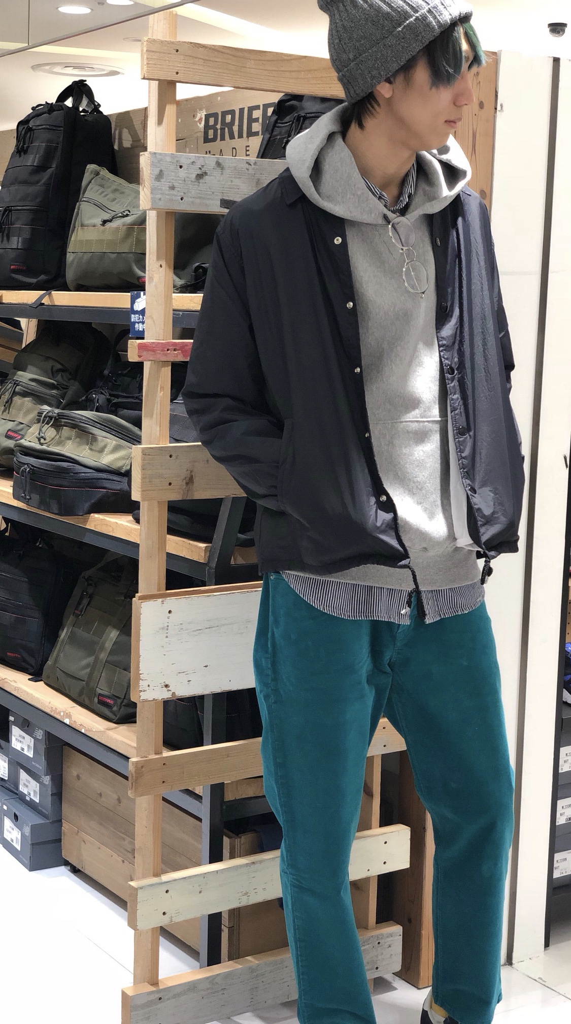 コーデュロイパンツがおすすめ☆ 今回はメンズスタイルです* コーデュロイパンツを使ったスポーティーなスタイリングにしてみました◎ トップスが渋い色目なのであえてボトムスはターコイズに☆ トップスとのバランスが取れ、カラーパンツですが可愛く着こなせるんです(*’.’*)♪ これからあったかく着れるおすすめのスタイルなので参考にしてみてください♪