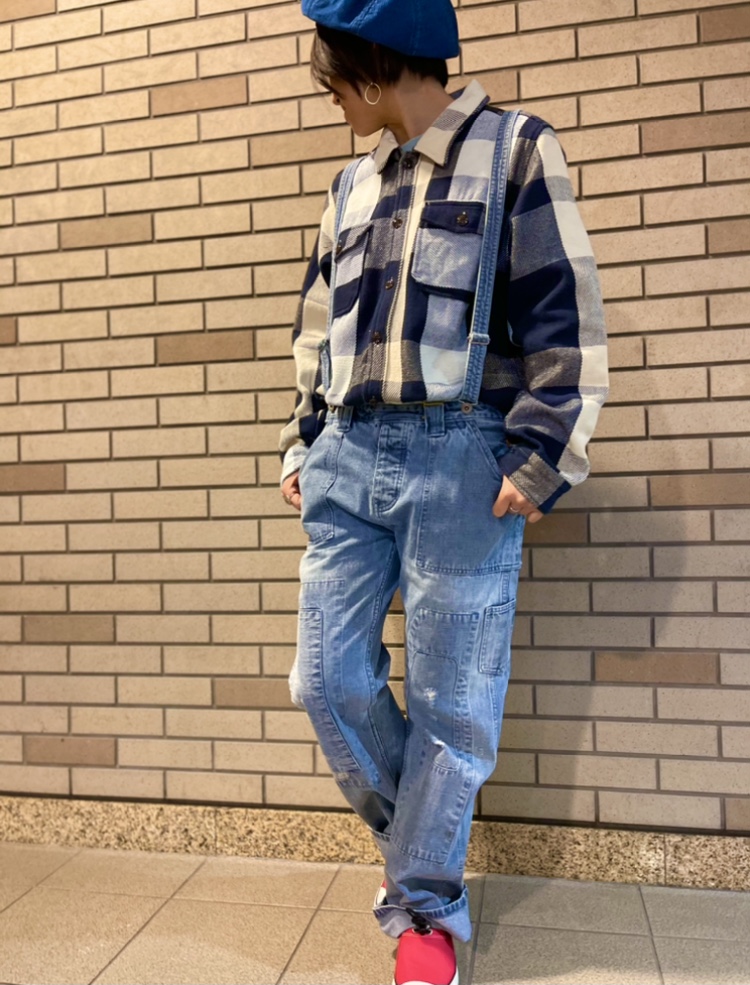 サロペットで着てみました☆ 人気のビブオーバーオールをサロペットにして着てみました(*^_^*) スタッフもお気に入りのコーデです* ウエストも大きめなので厚手のシャツをインしても、ごわつかずに着れましたよ◎ 是非チェックしてみてください☆ 【OLD BETTY’S】Denim Damage Bib Overall 【GREEN BOWL】G.B.Flannel Check CPO Shirts