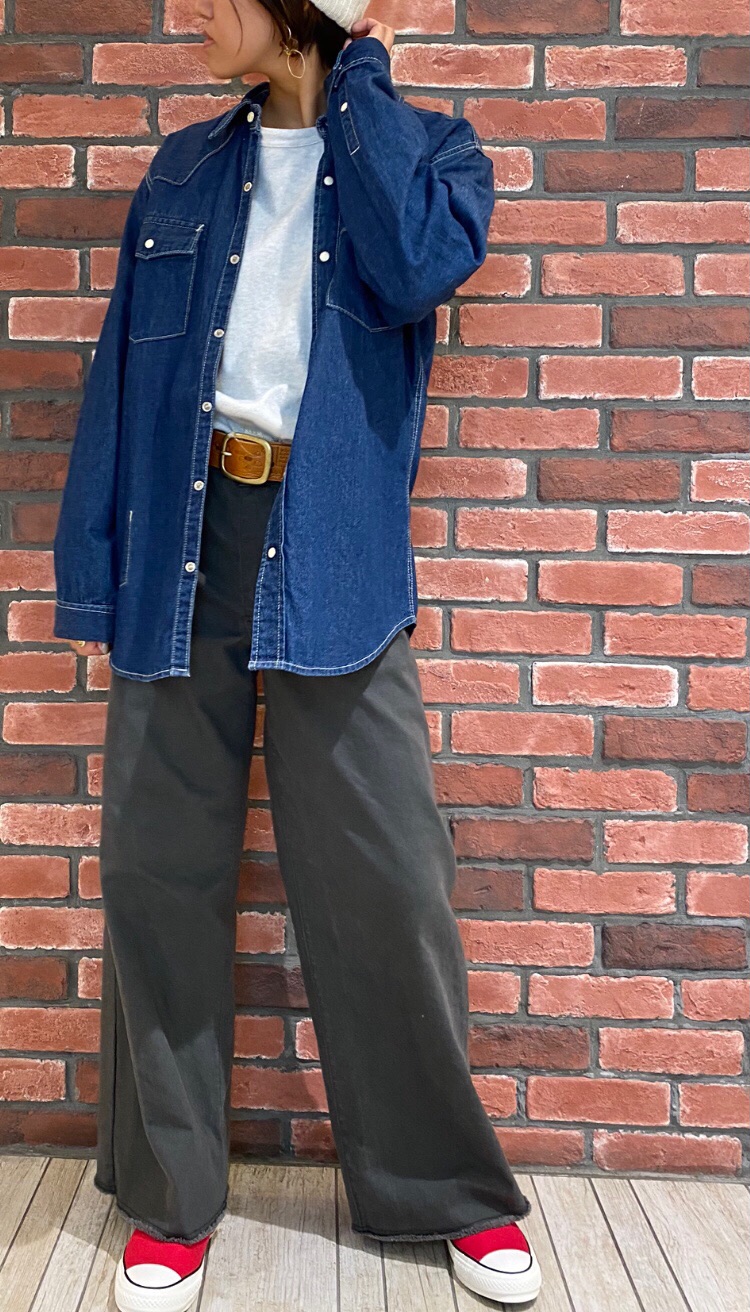デニムシャツと合わせて、シンプルでかっこいいコーデですね(*^_^*)