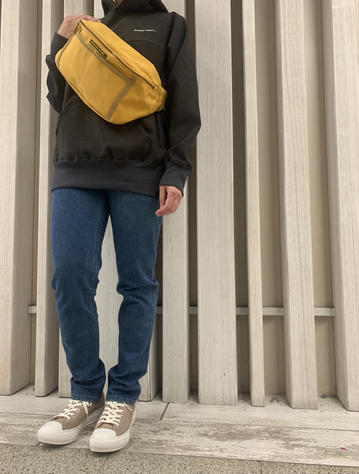 シンプルコーディネート(^^) 新作パーカーのブラックをデニムで合わせていたスタッフがすごくかっこよかったです!! シンプルなスタイルですが、差し色でイエローのボディバッグで雰囲気が変わります💫 新作コンバースもちゃっかり入れて春らしさを全開にしました! 【GREEN BOWL】 Stretch Denim Tapered Pants 【GREEN BOWL】 Canvas x Suede Waist Bag