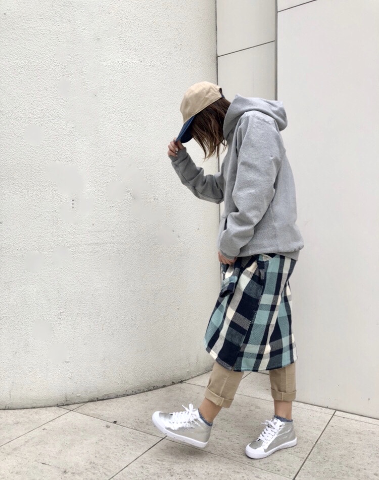スカート風コーデ♪ スタッフが大人気のチェックシャツで変わった着方をしていました!! ボタンを全部留めて腰に巻くとスカートのように着ていただけます♪ トップスに少しゆったりしたものを着たらシャツの襟部分も隠れます☆ 是非参考にしてみてください(*^_^*)