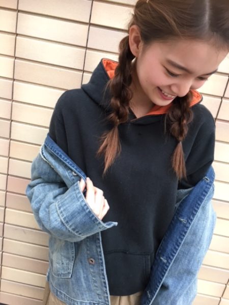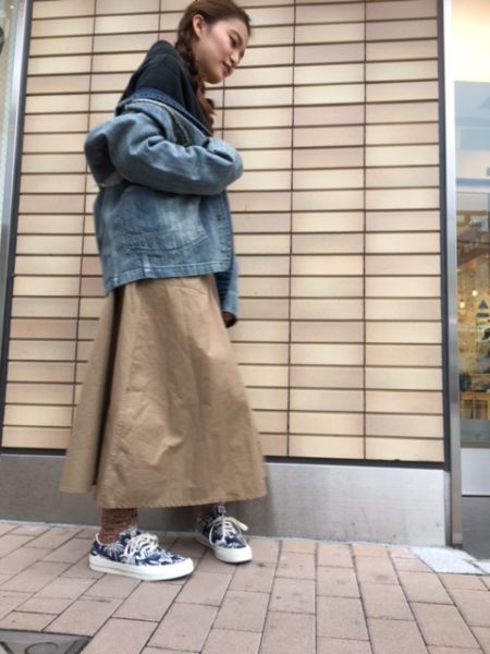 スタッフオススメコーディネート♫ 明石店の泊さんのコーディネート♫ 今年っぽくデニムをづらして着ているのが 若者!泊さんらしいスタイルです(*^^)v デニム×パーカーでボーイッシュになりすぎないように ボトムスはスカートを合わせているところが◎ パーカー裏地のオレンジがアクセントになったコーディネートでした(^0_0^)!! 是非参考にしてみてくださいね**