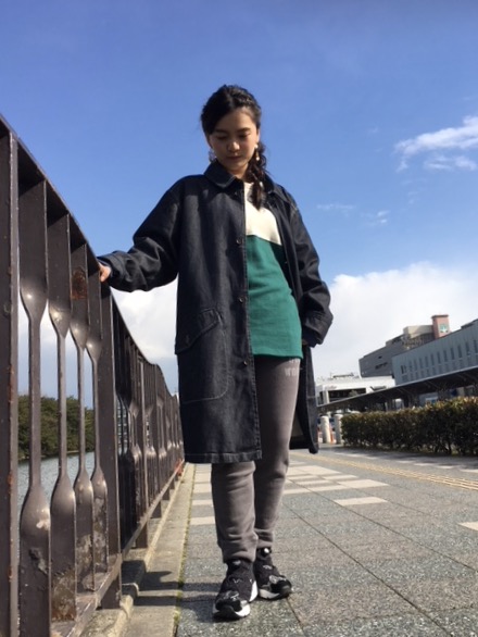 スタッフスタイル* 明石店の泊さんスタイル* 春アイテムでかっこよく着こなしてくれました♪ 新作のトレーナーにグリーンボウルのスウェットパンツとなかなか高度なスタイルと思いがちなスタイルですが、デニムのステンカラーコートを合わせることで締まりのある着こなしに** 今年もステンカラーコートは大人気間違いなしのアイテムです☆ 今日もなかなかの寒さですが、一週間の始まり☆頑張っていきましょう!! 私達は店舗で皆さまのご来店お待ちしております♪♪