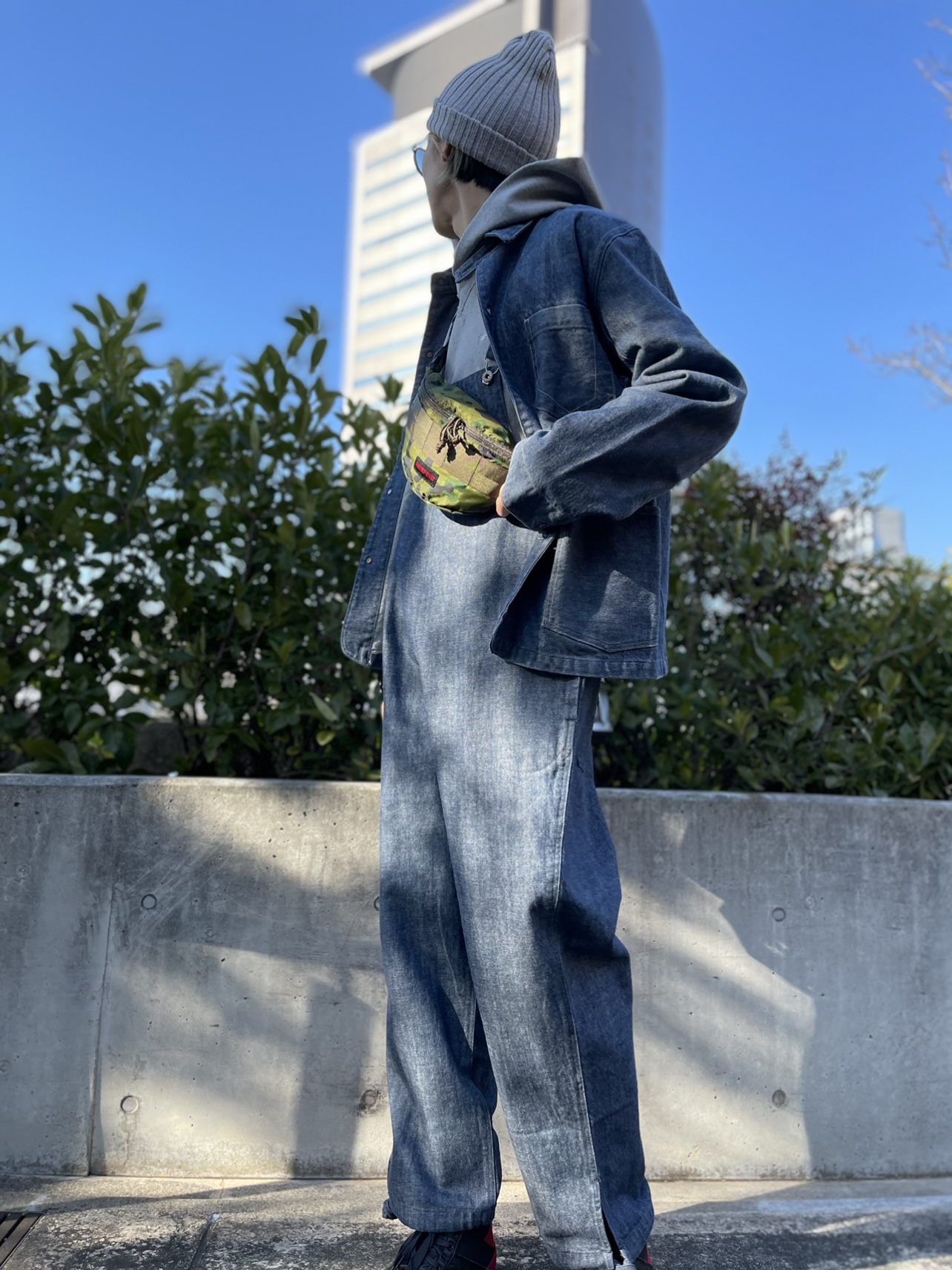 デニムコーディネート デニムのカバーオールに同素材のオーバーオールを合わせ、セットアップ風にしましたよ⭐️ かっこいいですよね‼️ アクセントに迷彩のボディバッグをプラス^_^ 是非参考にしてみて下さいね! GREEN BOWL 11oz Denim Coverall 【GREEN BOWL】G.B. Deck Overall 【GREEN BOWL】 Mix Knit Cap