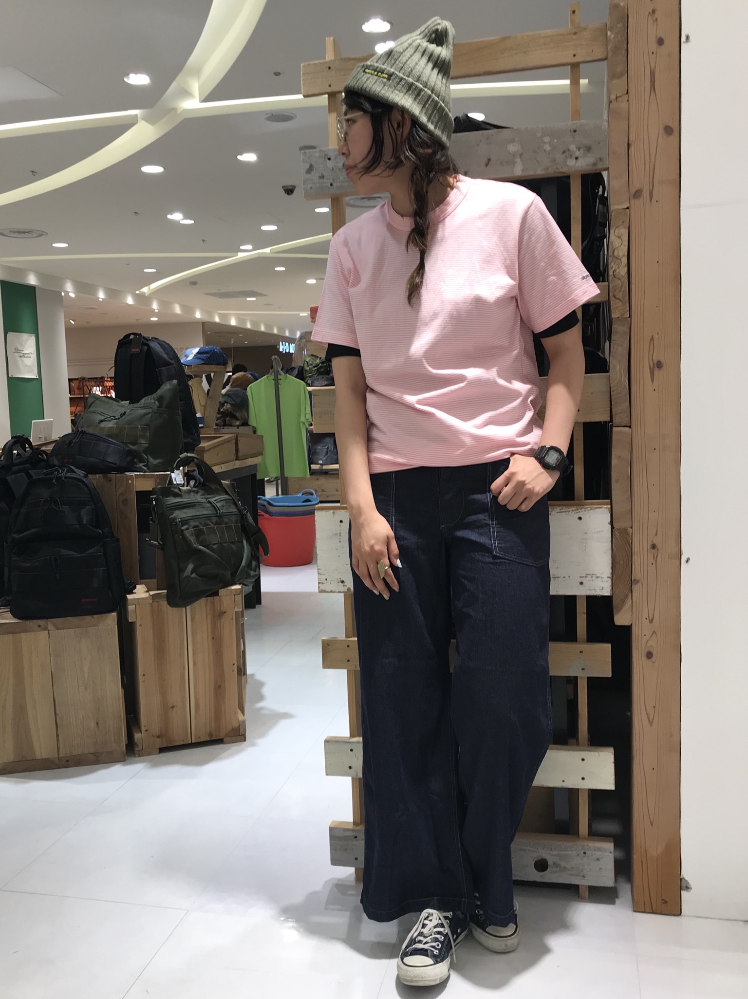 デニムパンツコーデ♪ デニムパンツコーディネート* 少し濃いめのカラーのデニムに かわいいカラー、ピンクのボーダーTシャツを合わせて カジュアルな着こなし★ デニムのパンツは生地が薄くて涼しいです♡ ワイドシルエットなのでラクに着ていただけます* Tシャツは伸縮性の効いた生地なんですよ★ サイズ展開もございますので男性の方にも着ていただけます! 是非チェックしてみてくださいね♪♪