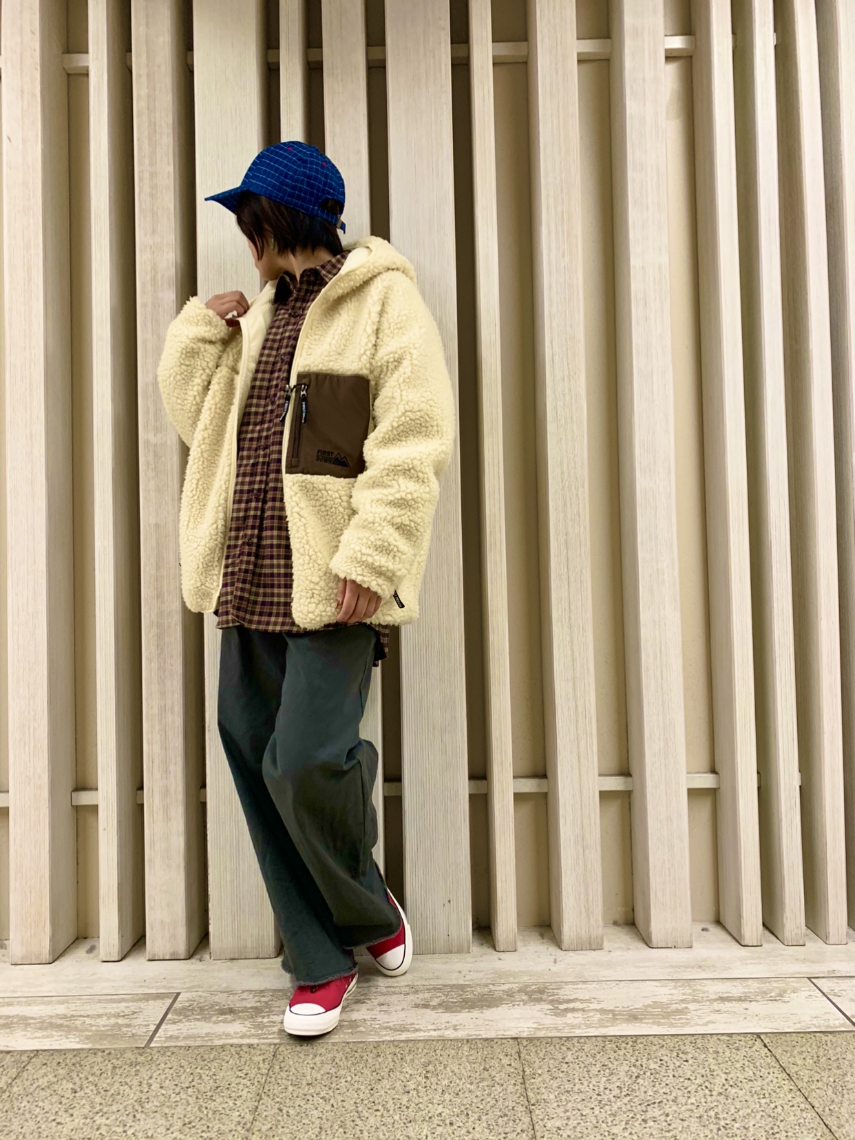 ボアジャケットが人気ですよ⭐️ ボアジャケットが人気です⭐️ そのボアとチェックシャツを合わせました♪ パンツは暗い色で抑えめにし、赤のスニーカーで差し色を^ ^ 是非参考にしてみて下さいね! 【OLD BETTY’S】Flannel Check Loose Shirts 【GREEN BOWL】 Baseball Cap 【OLD BETTY’S】Cut Off Wide Pants 【FIRST DOWN】タンブリングボアパーカー