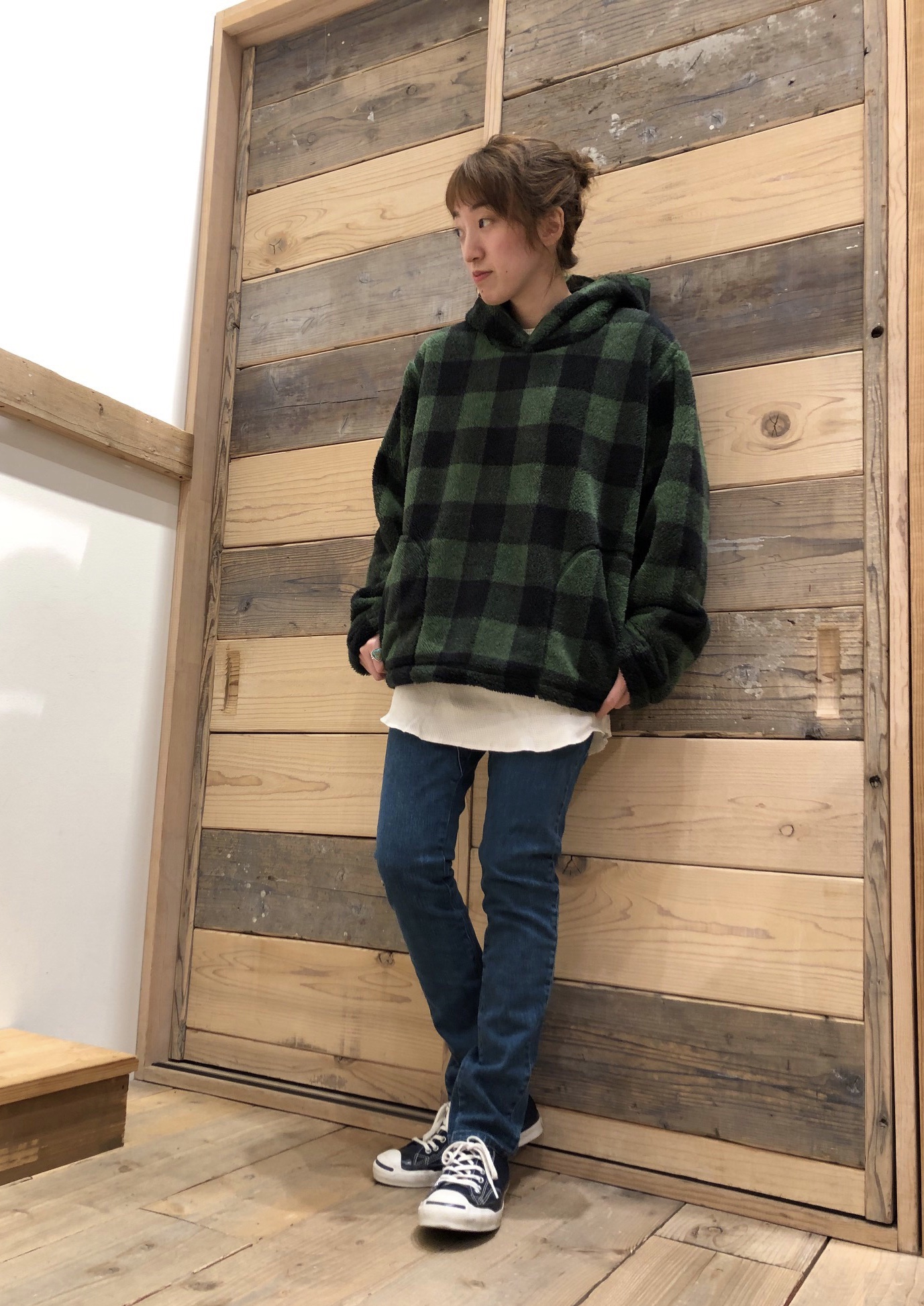 ボアパーカーがオススメです! ボアパーカーがやっぱり大人気です♪ あったかく着こなせるボアパーカーは男女問わず人気なんです◎ 緑チェックの色も可愛いのですがサッと下から白が見えることでメリハリが出てスッキリ見せてくれるんです* アウターもいらないくらいあったかいのでフェスなどのシーンでも活躍間違いなしですよ(*’.’*) 是非おすすめのアイテムなのでチェックしてみてくださいませ☆★