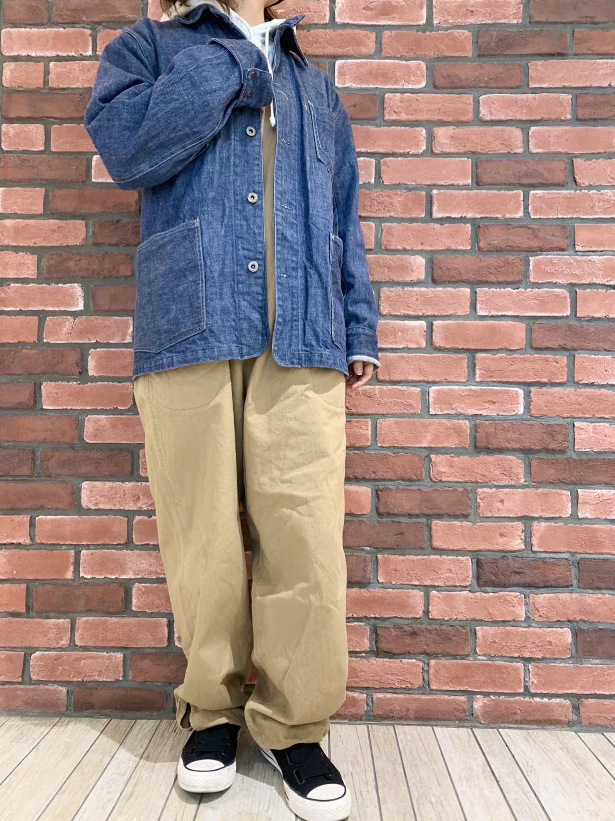 可愛い着こなしのスタッフがいました‼️ とても可愛らしいコーディネートのスタッフがいたのでパシャリっ‼️ ベージュのオーバーオールの上からカバーオールを合わせてます^ ^ アメカジ感あふれるコーディネートを是非参考までに◉ 【GREEN BOWL】G.B. Deck Overall GREEN BOWL 11oz Denim Coverall