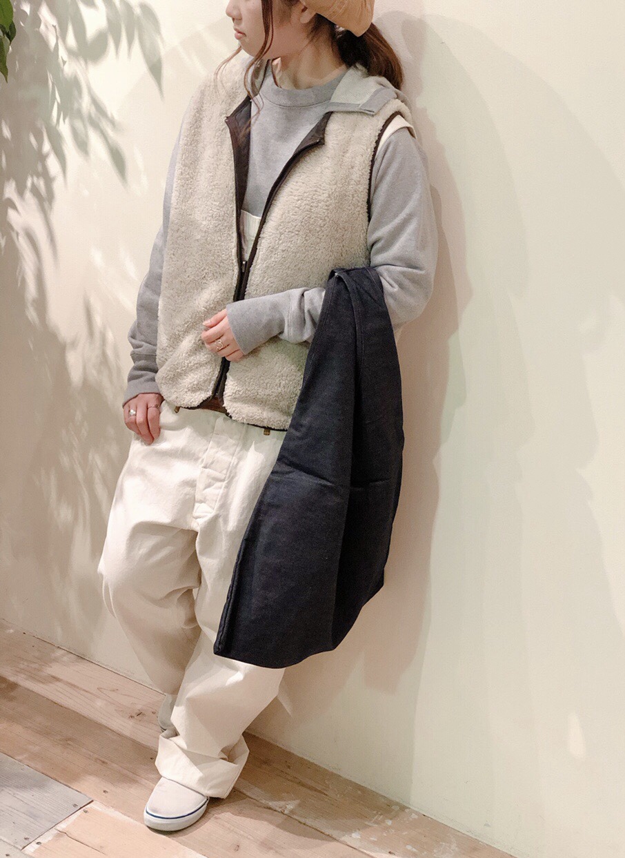 同じアイテムでも見え方を変える☆ 本日はオーバーオールdayと題しまして!! また見え方が少し変わった雰囲気でのスタイリングでご紹介しようと思います(*’.’*) 先程は少しクールな爽やかさでまとめてみましたが、今回はホワイト系でまとめた可愛らしさもあるスタイリングにチェンジしてみました♪ 全体が明るく見えるので重たくなりすぎず、上からボアベストを閉めて着てみたのでパンツっぽくも着ていただけるんです◎ 色合わせ、着方で見え方が変わるので楽しめるアイテムとなっております!! 是非チェックしてみてください(^_^)