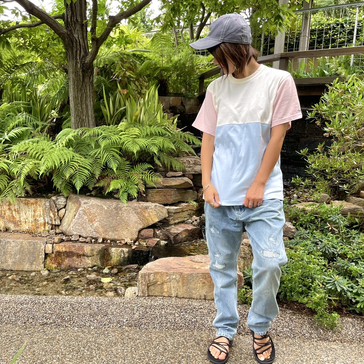 夏らしいカラーがかわいい☆ デニムとTシャツで夏らしく(*^_^*) サルエルパンツはゆったりしているので夏場でも履きやすいです☆ Tシャツの配色のブルーととデニムの色も似ていて統一感のあるコーデに♪♪ 全然参考にしてみてください* 【GREEN BOWL】 Color Scheme T-Shirts 【OLD BETTY’S】Denim Remake Sarouel Pants