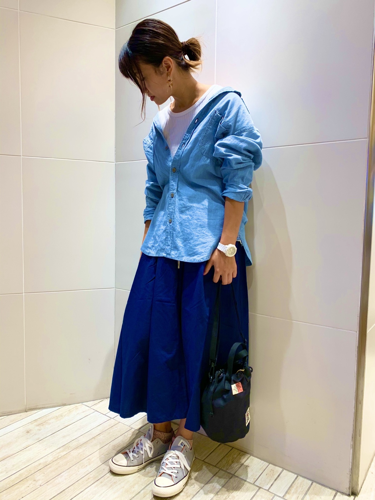 季節の間のワントーンコーデ 今回は夏と秋の狭間のコーデです!!! ブルーのワントーンコーデで爽やかな色合いですし 長袖シャツを着ているので秋にもとれます/// 是非参考にしてみてくださいね!! 【Born】Rib Tank Top 【GREEN BOWL】Chambray Work Shirts 【OLD BETTY’S】 Volume Long Skirt 【OLD BETTY’S】Canvas Chalk Bag