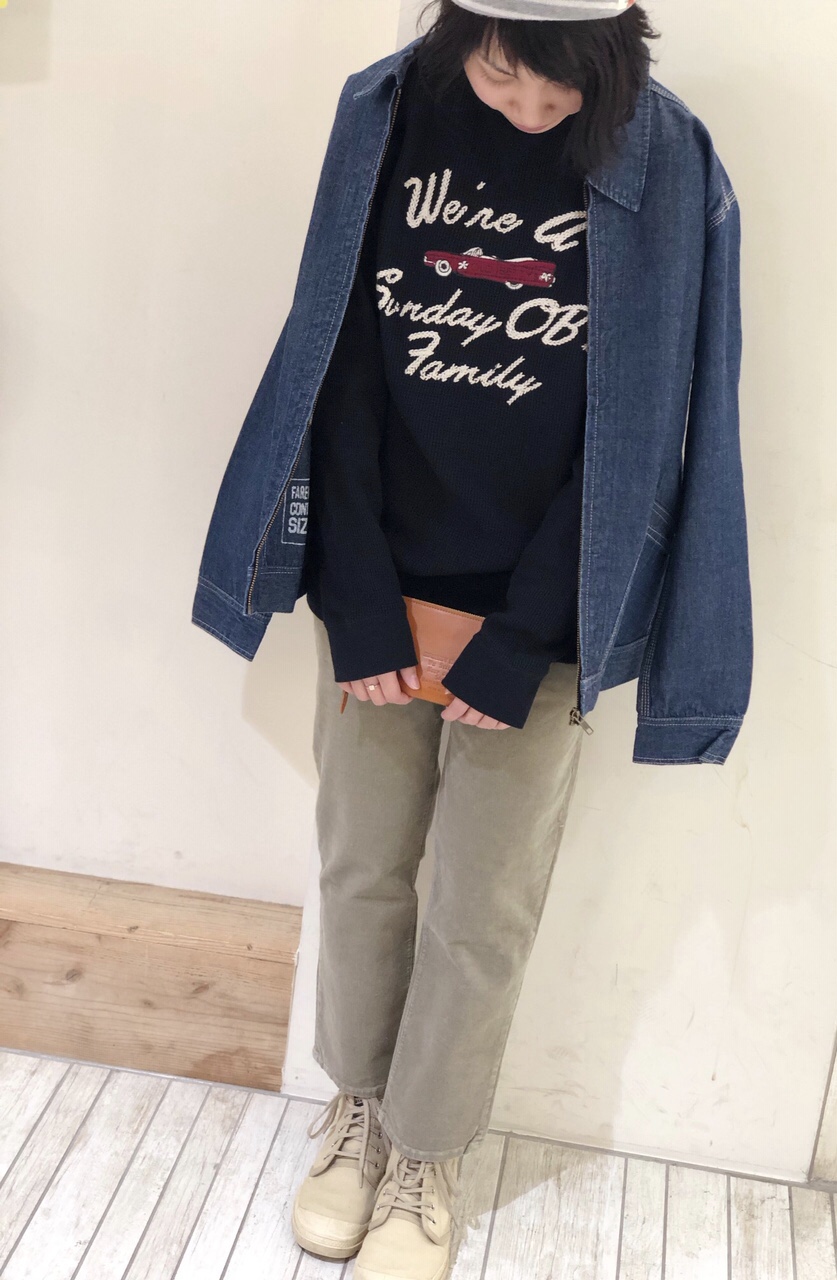 新作を着てみました! 今回は新作アイテムを着てみましたよ(`・ω・´) 黒をチョイスしてコーデュロイパンツと合わせてみました!! 刺繍が大きめに入っておりますが黒だとキリッと締まって見えてくれますよね* ボトムスを淡い色にしたこともありとても調和がとれていました☆★ 是非おすすめのスタイリングなのでチェックしてみてくださいね(*’.’*)