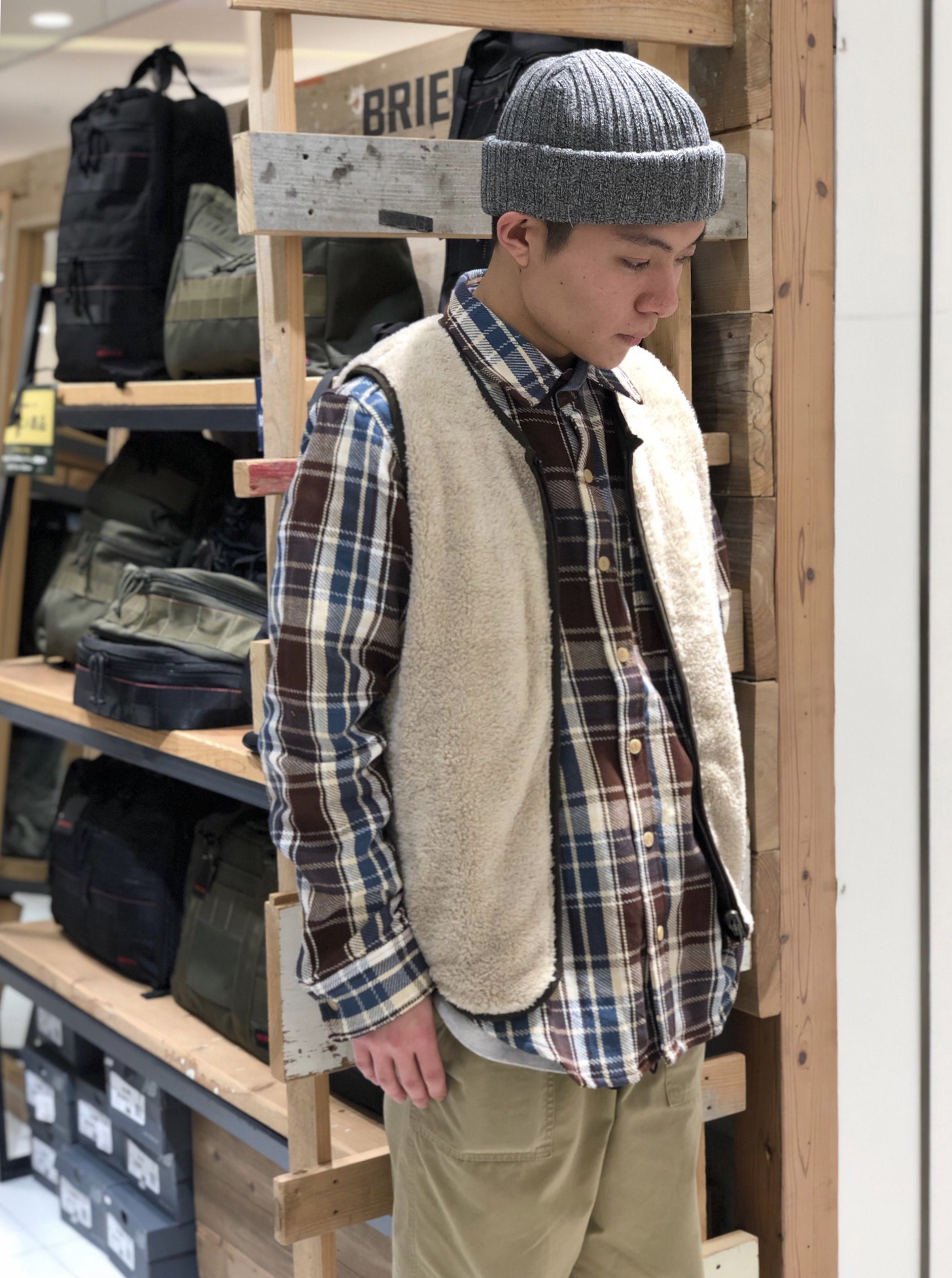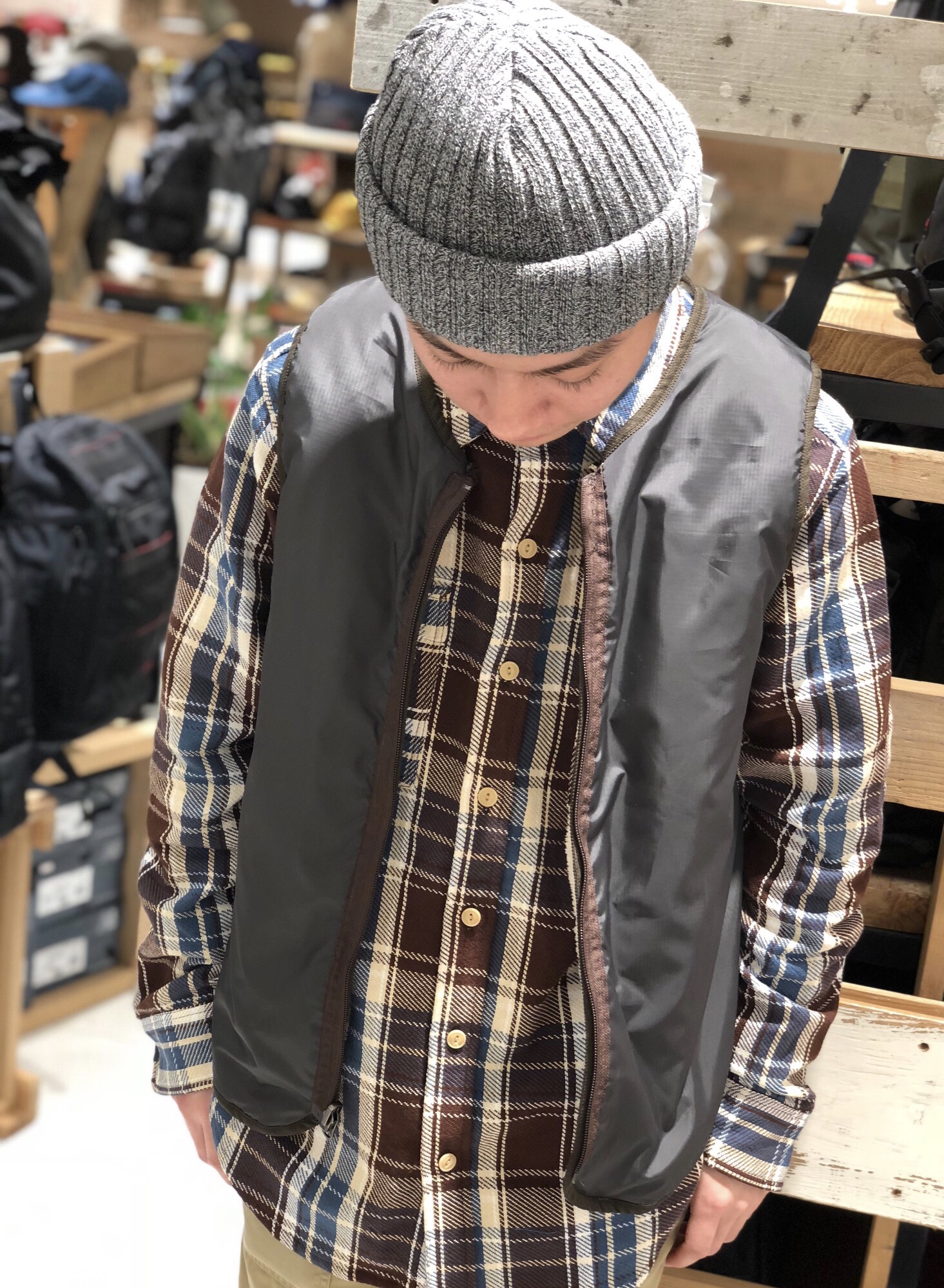 新作ベストの登場です☆ 新作ボアベストが入荷致しました* 早速メンズスタッフが着用してみましたよ◎ 今回はなんと前開きジップなんです!! 脱ぎ着もしやすくなっております♪ そして実はこちらリバーシブルとなっているところも嬉しいポイントなんです☆ ライナーベストとしても活用できるおすすめアイテムなので是非チェックしてみて下さいね◎