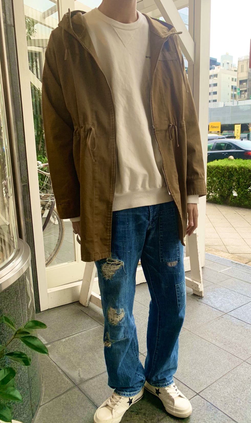 早速着てみました!! 新作のミリタリージャケットを着てみましたよ~ デニムと合わせてカッコよくしました!! 2色展開ですが2色ともデニムに合います/// ウエスト辺りに絞れる機能があるのでシルエットも変えることが出来ます!! 是非チェックしてみてくださいね☆ 【Born】Fishtail Full Zip Long Parka 【OLD BETTY’S】 12oz Denim 5Pocket Damage Pants