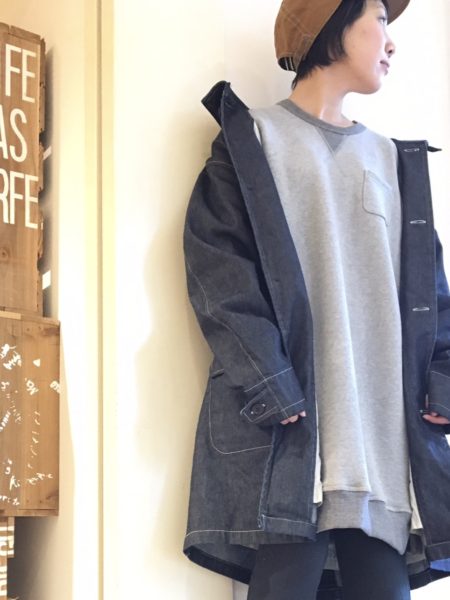 中にデニムシャツを着てもゆとりありです☆彡ですが!?袖巾が身巾とのバランスに比べて少しコンパクトなので着ぶくれしませんよ(*^。^*)