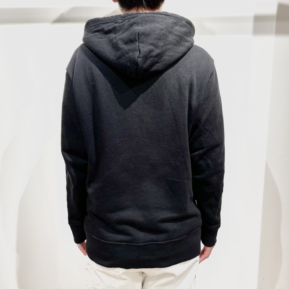 フードは、中心部分で少し重なりがあるので、メンズな雰囲気になります
