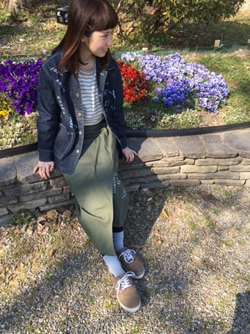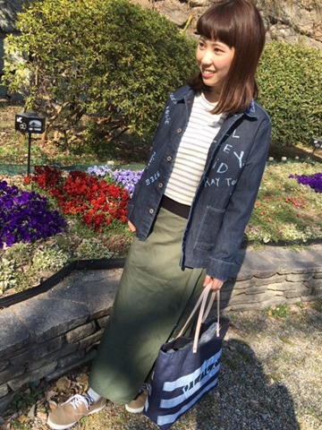お待たせ致しました★ お待たせいたしました☆ デニムのカバーオールが入荷してきました!(^^)! 鳥井さんをお花と一緒に春らしいコーディネートでパシャリ☆ これからの季節軽く羽織るにはピッタリのアイテムです♪ そしてそして新作は、、、スカートもです(^○^)!! ラップロングスカートですが、スッキリとしたシルエットなので 体型を綺麗に見せてくれるんです(*^_^*) 頼もしい1枚ですね♪(笑) 最後に、春らしい爽やかなショットを・・・**