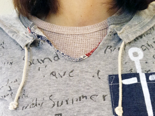先にリブ生地で衿ぐりを縫い、後で少し衿ぐりから下にフードつけているので着用するとセーラー衿のように感じますよ‼