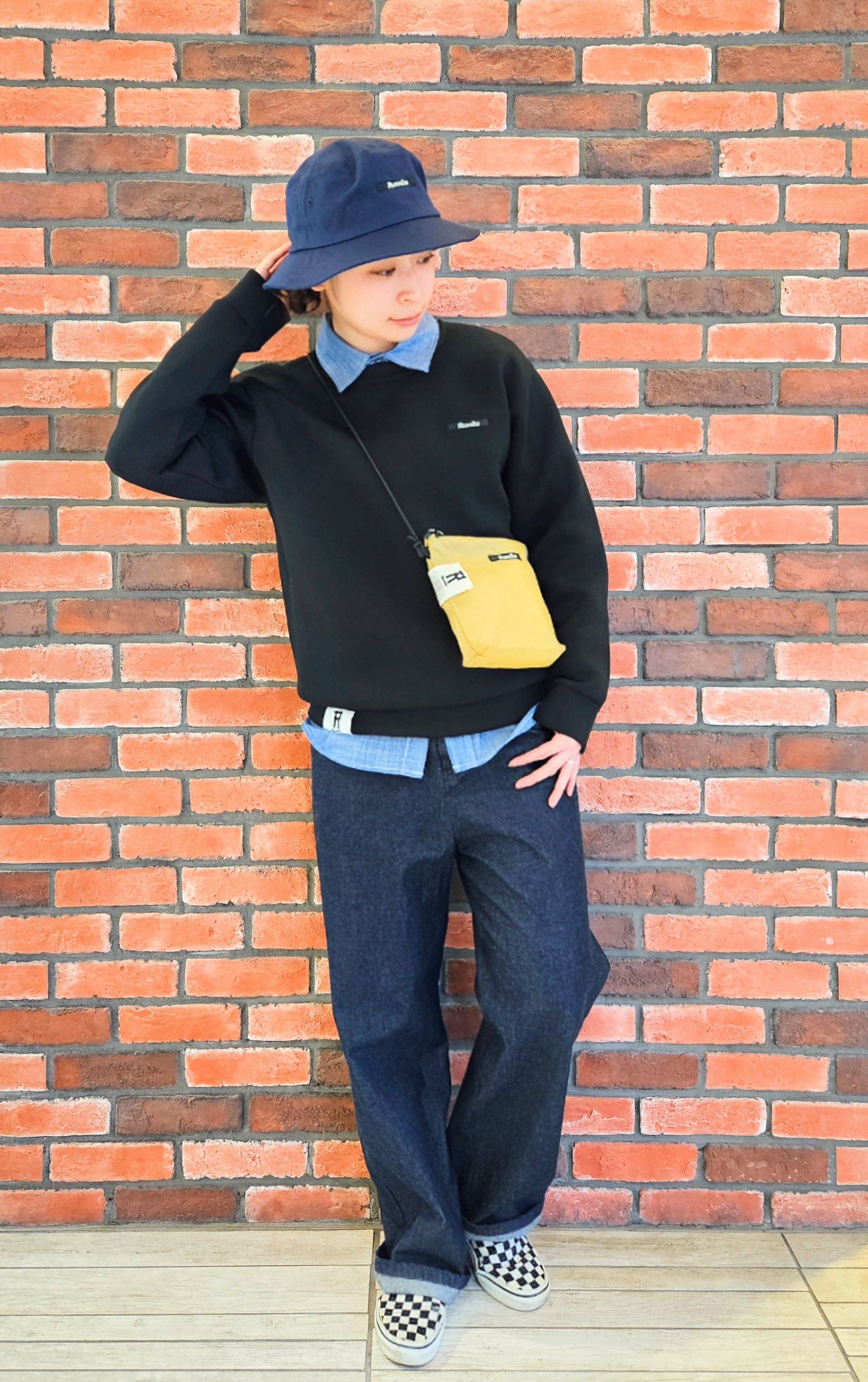 ネイビーカラーのバケットハットに合わせて