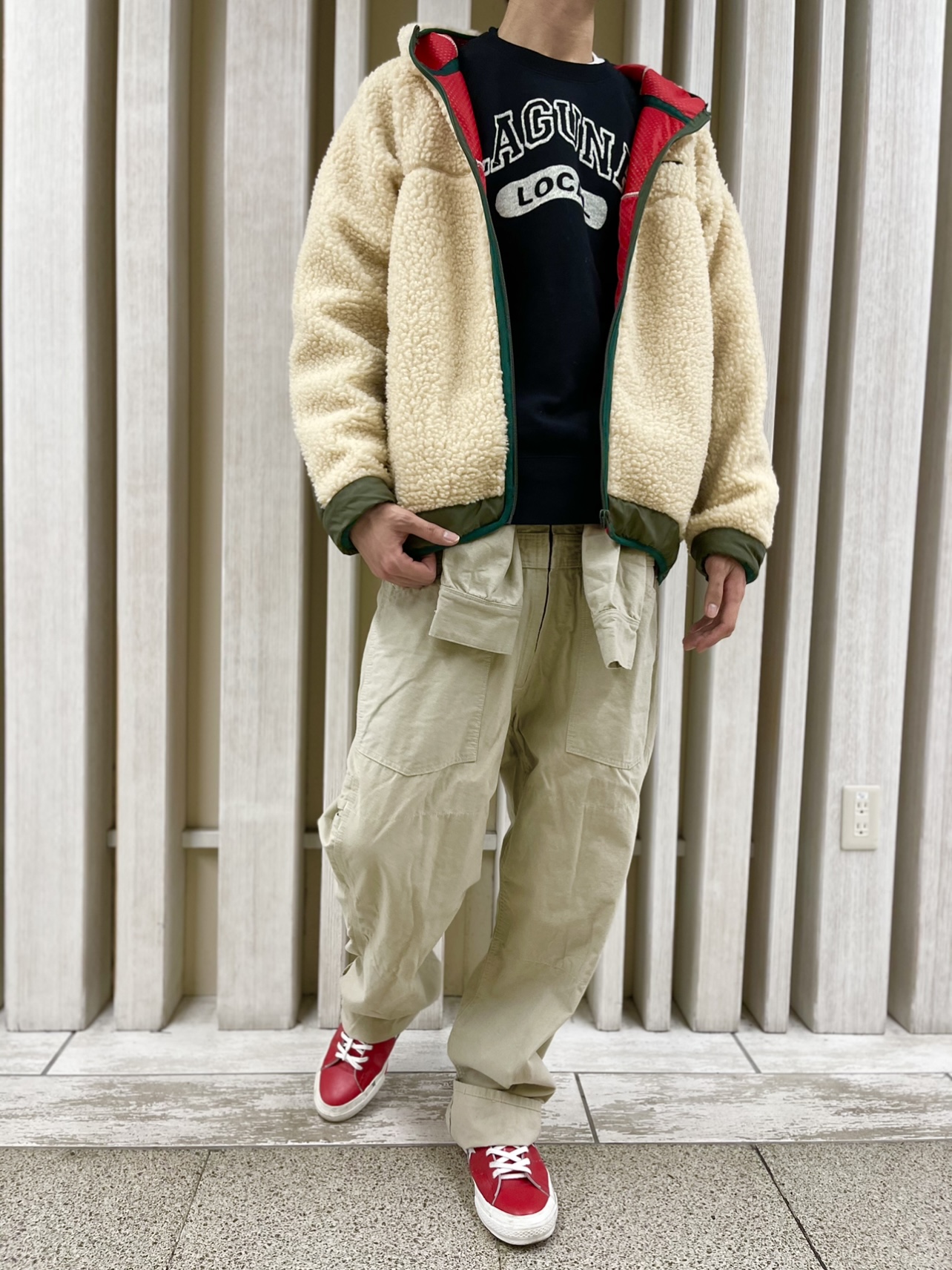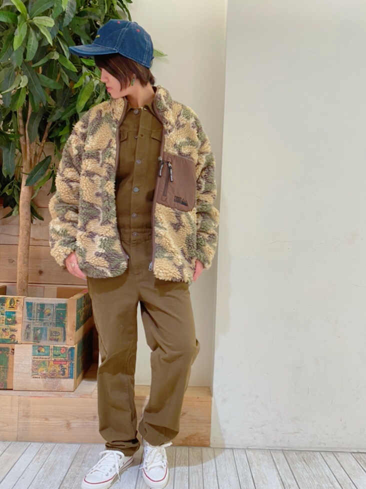 つなぎとカモフラのボアを合わせてメンズライクなコーデに☆