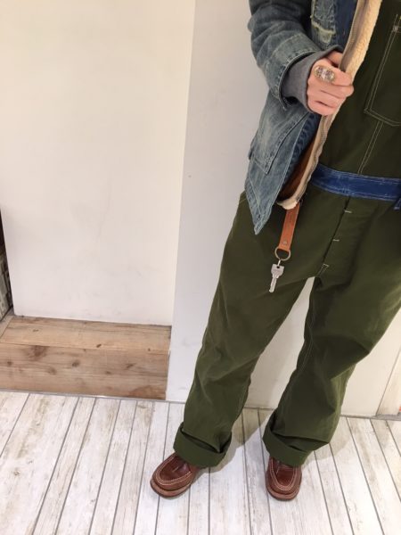 オーバーオールでもなかなか珍しいオリーブ色ですが、