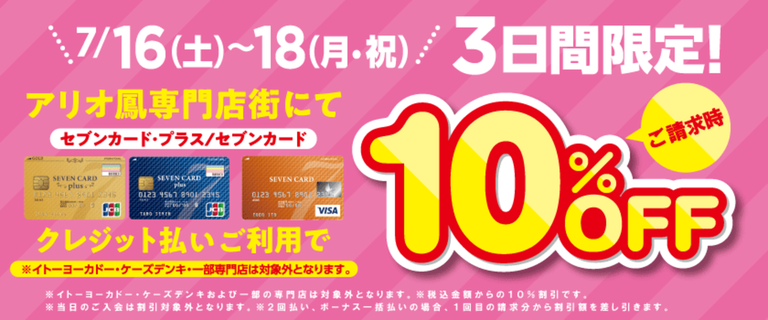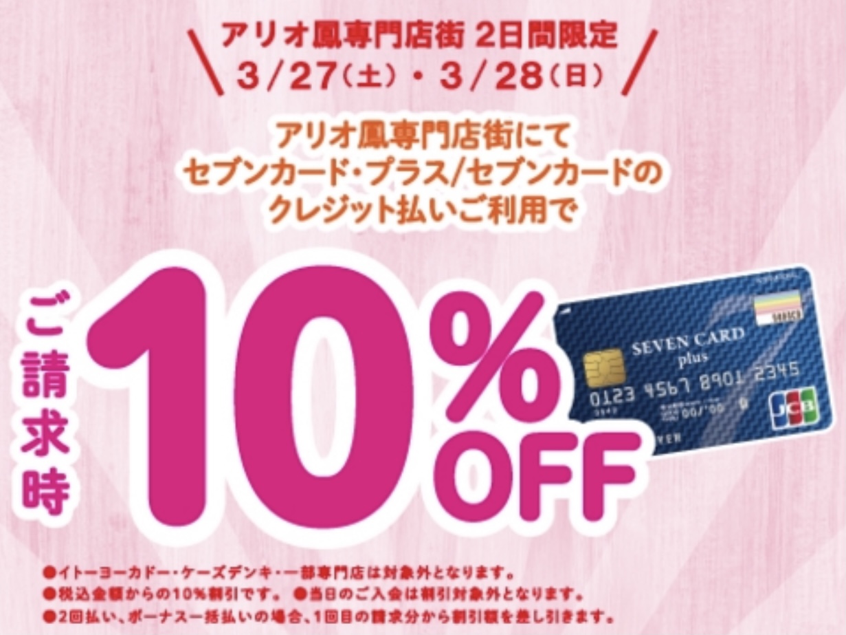 アリオ鳳専門店街にてセブンカード・プラス/セブンカードのクレジット払いご利用で、ご請求時10%OFFになります!!