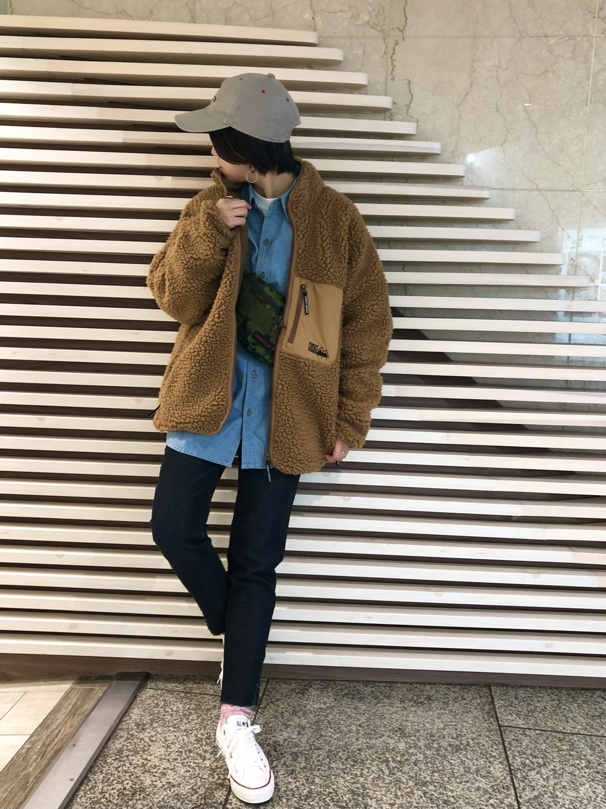 シャンブレーシャツのたすき掛けがアクセントに♪