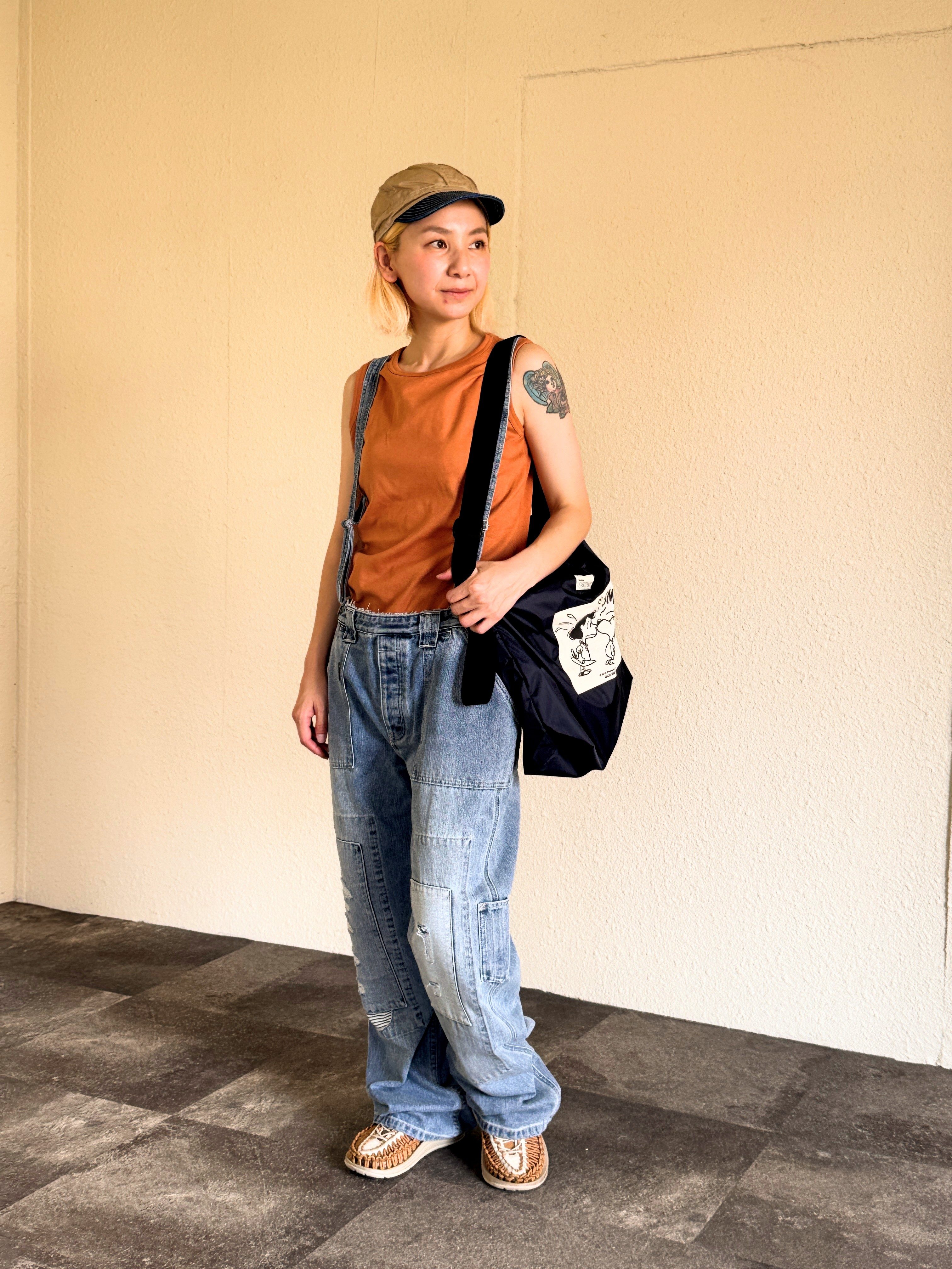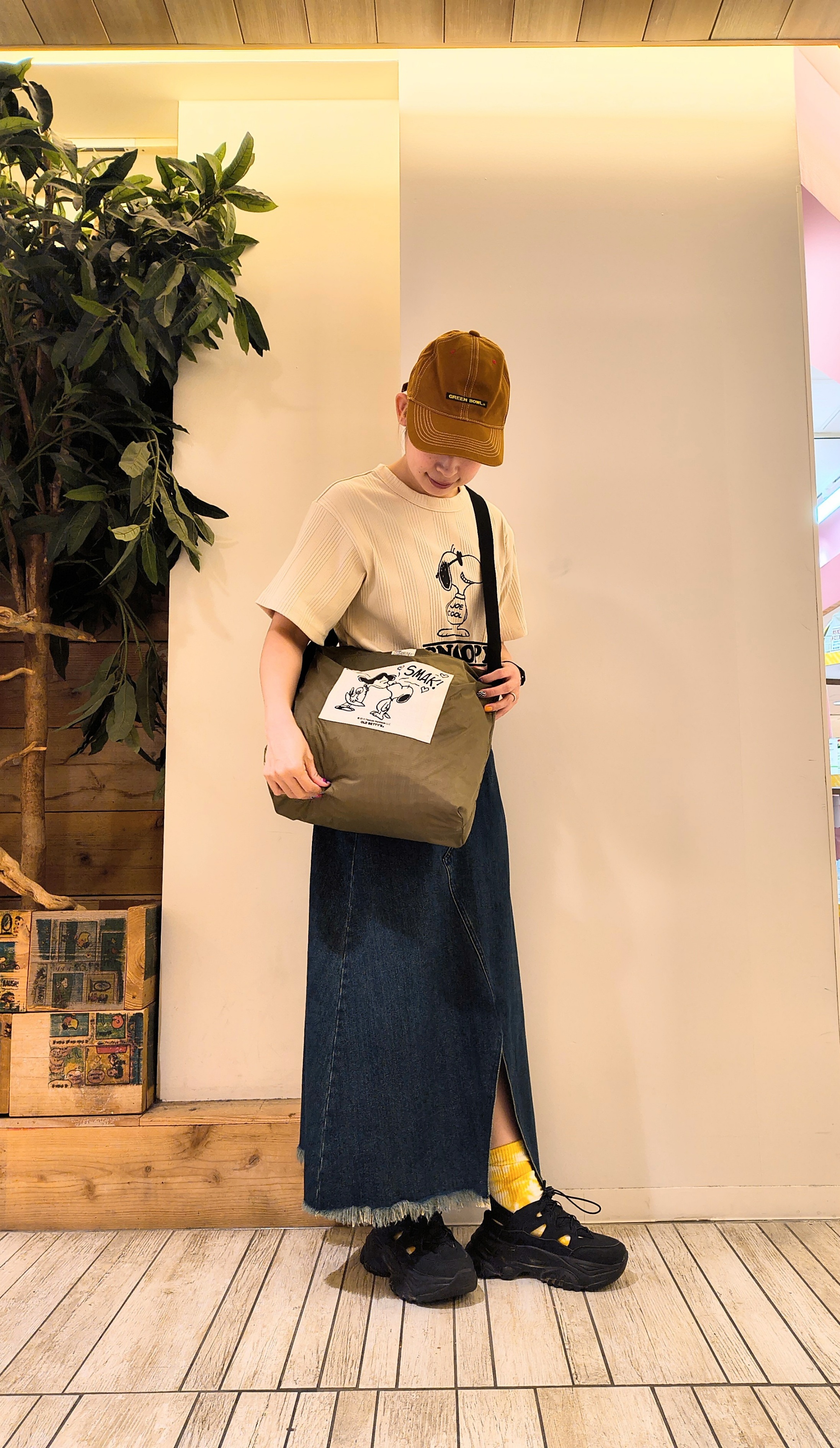 今回はランダムリブの生地が可愛いスヌーピーTシャツとデニムリメイクロングスカートで