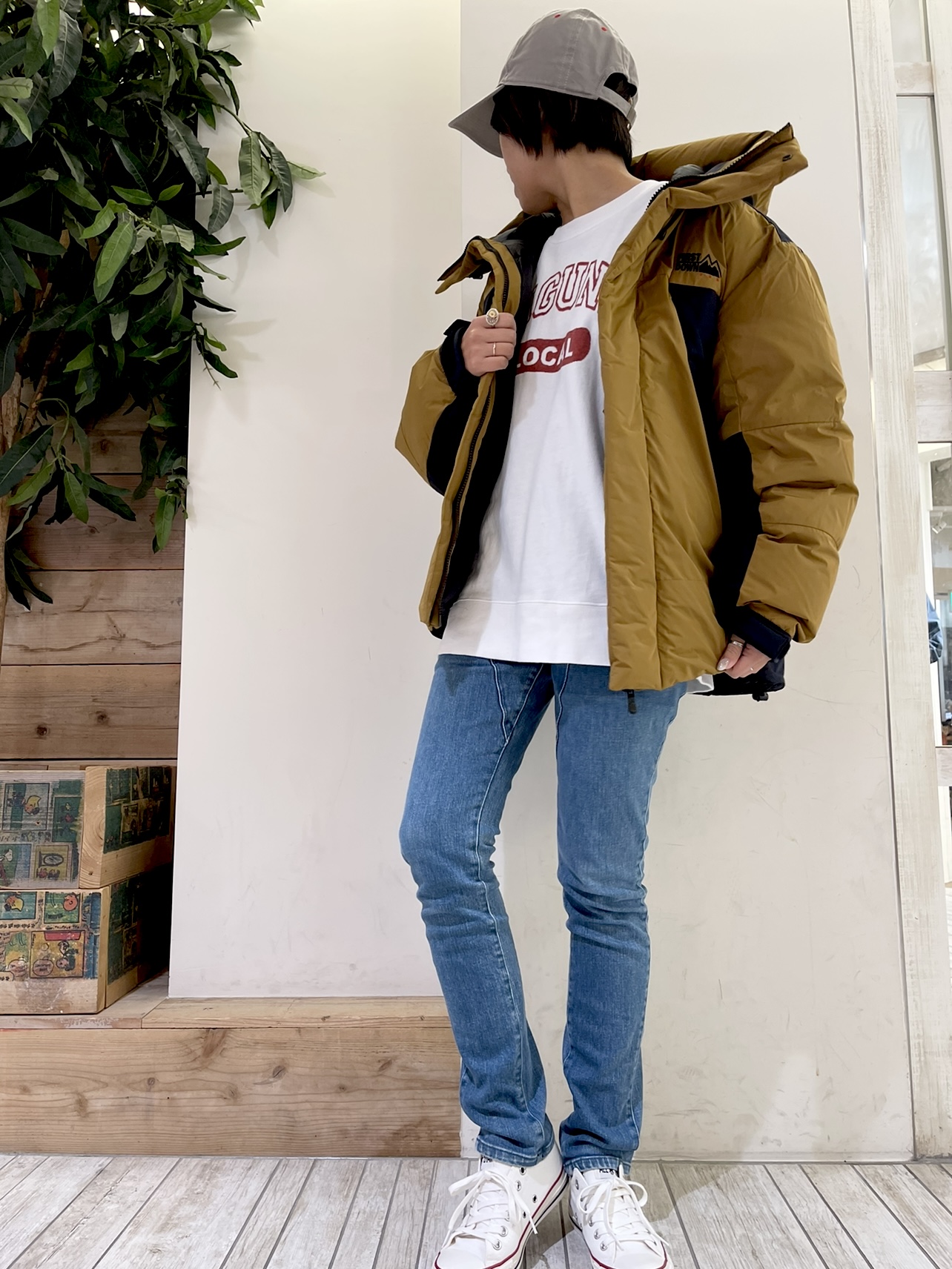 メンズっぽくなりがちなダウンジャケットですが、細身のボトムやレギンスで合わせると女性らしい着こなしが出来ますよー*