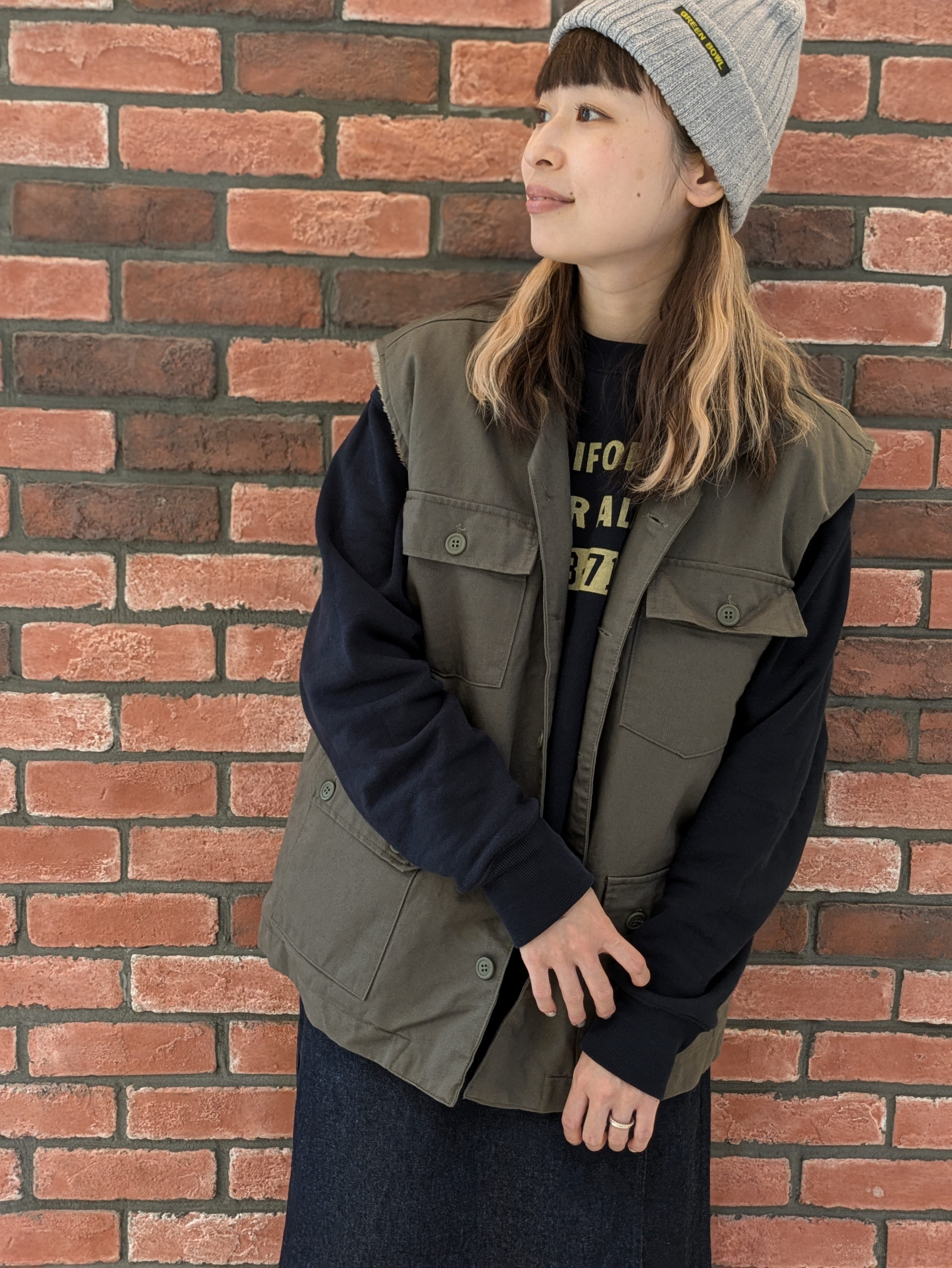 ミリタリー調の裏ボアベスト。オーバーサイズですが、袖が無い分バランスがとり易いです!!