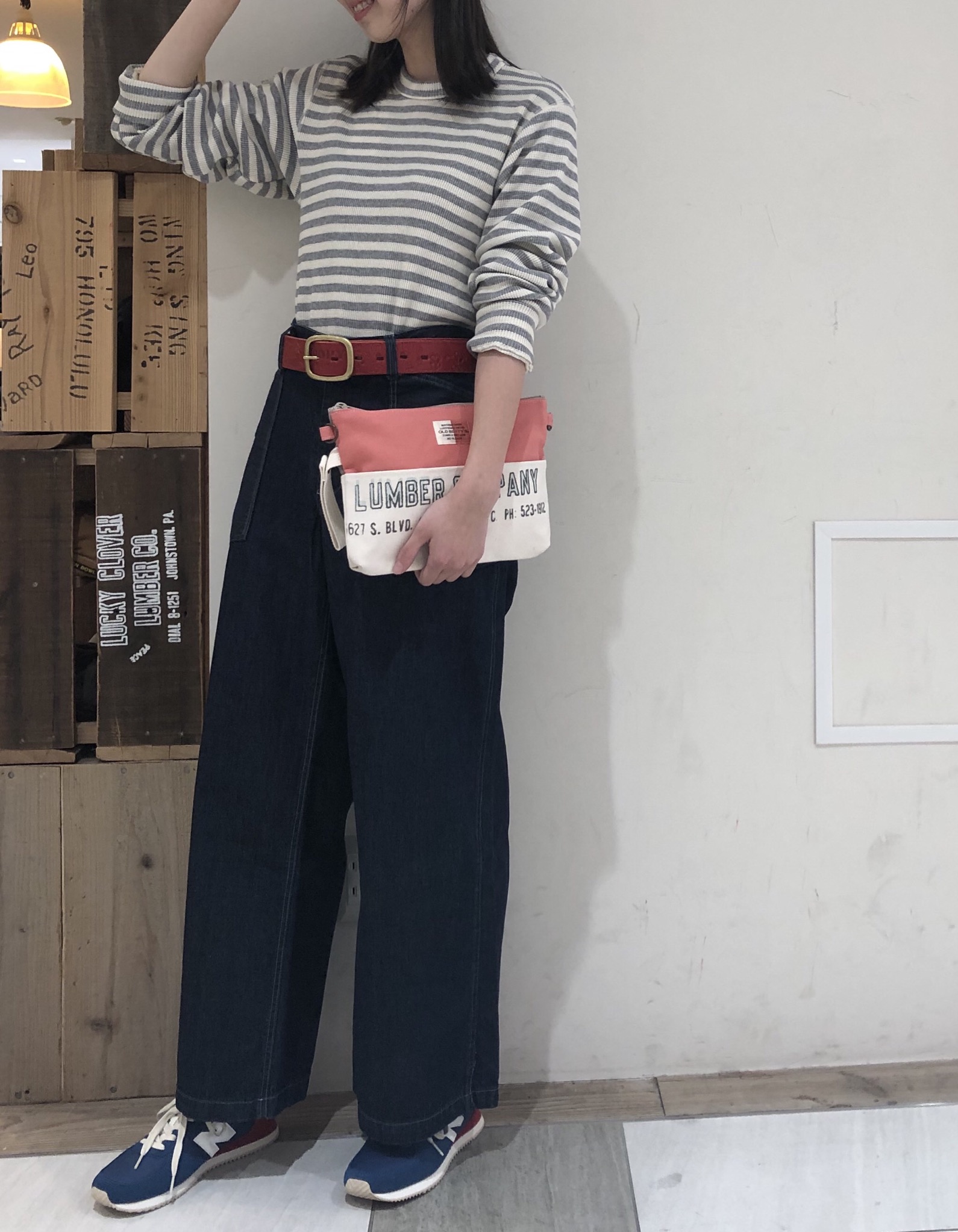 スタッフはアクセントにベルトもそうですが、バッグにもカラーものを取り入れているので