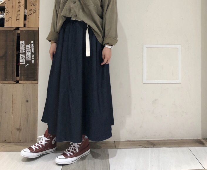 ボリュームスカートは150cm代のスタッフが着用しても長すぎず足首が見えてくれて小柄な方にも着ていただけるので是非チェックしてみてください◎
