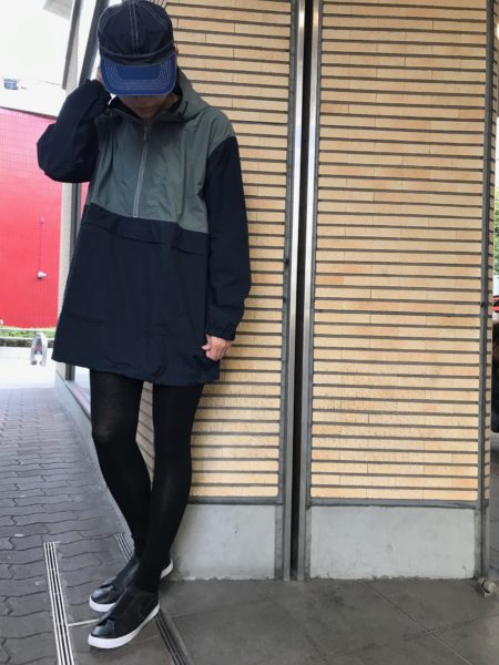 レギンスのプリントとマウンテンパーカーも