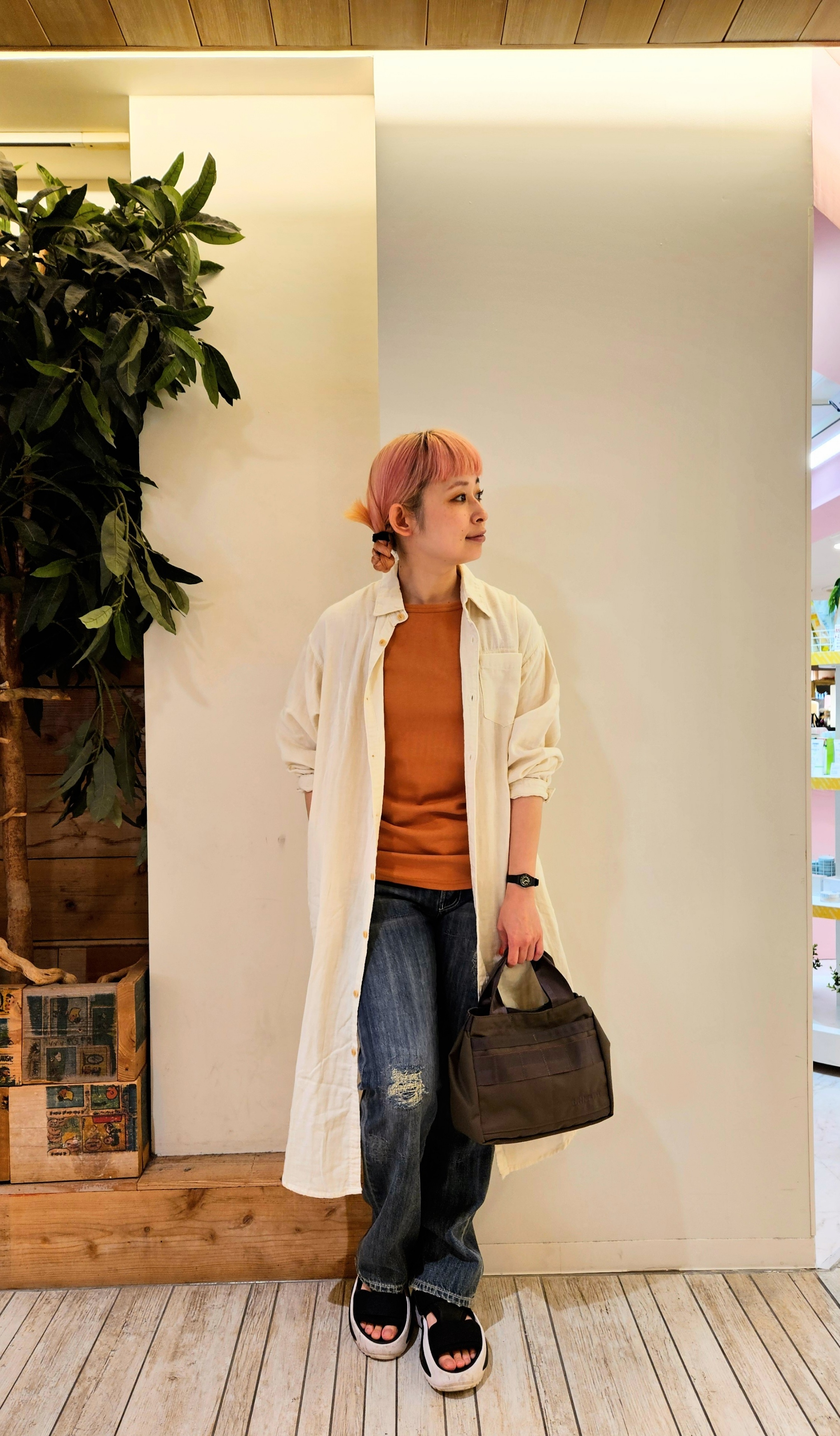 サンプルアイテムのロングシャツワンピ―スとダメージジーンズを用いた