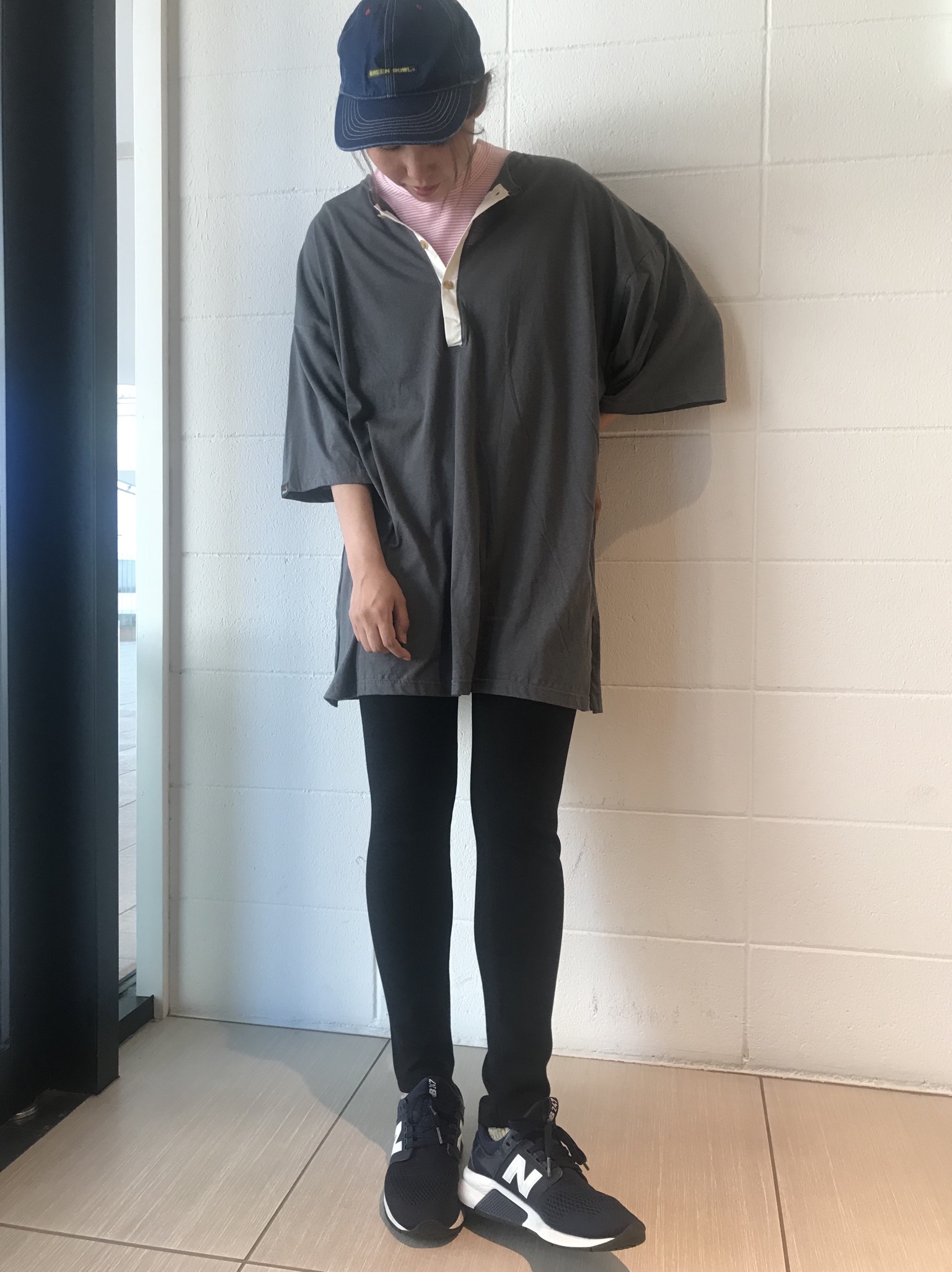 ヘンリーネックTシャツのインナーにピンクのボーダーTシャツを合わせてみました♪♪