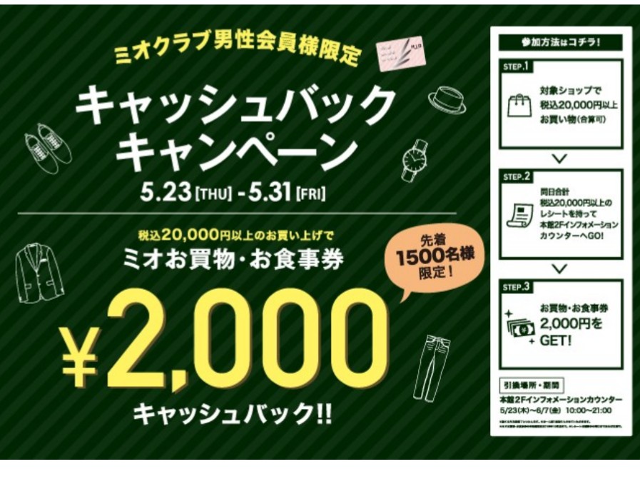 さらに、23日木曜日~31日金曜日の期間、MIOクラブカード男性会員限定!で、キャッシュバックキャンペーンが実施されます☆税込20,000円以上ご購入で、2,000円分のMIOお買物券プレゼントというお得なキャンペーンです♪