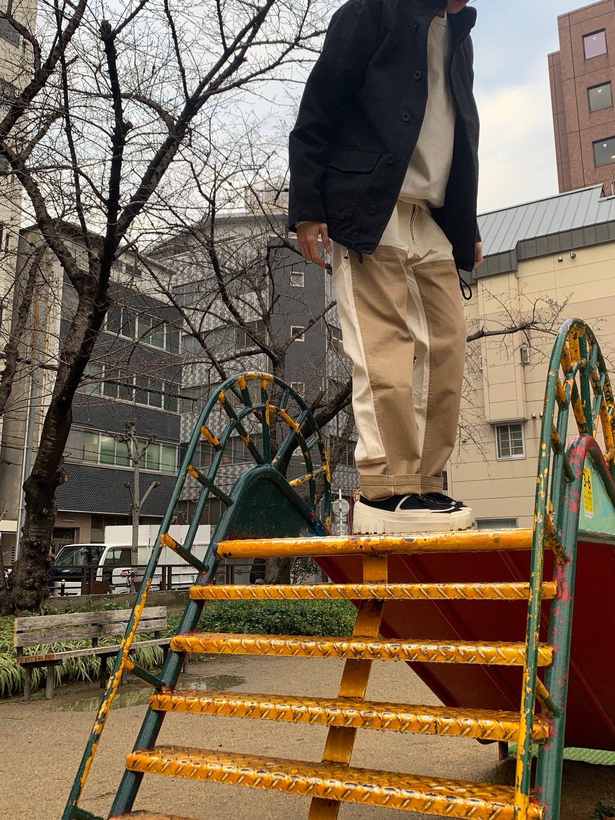 スウェットパンツに黒のアウターを合わせました!