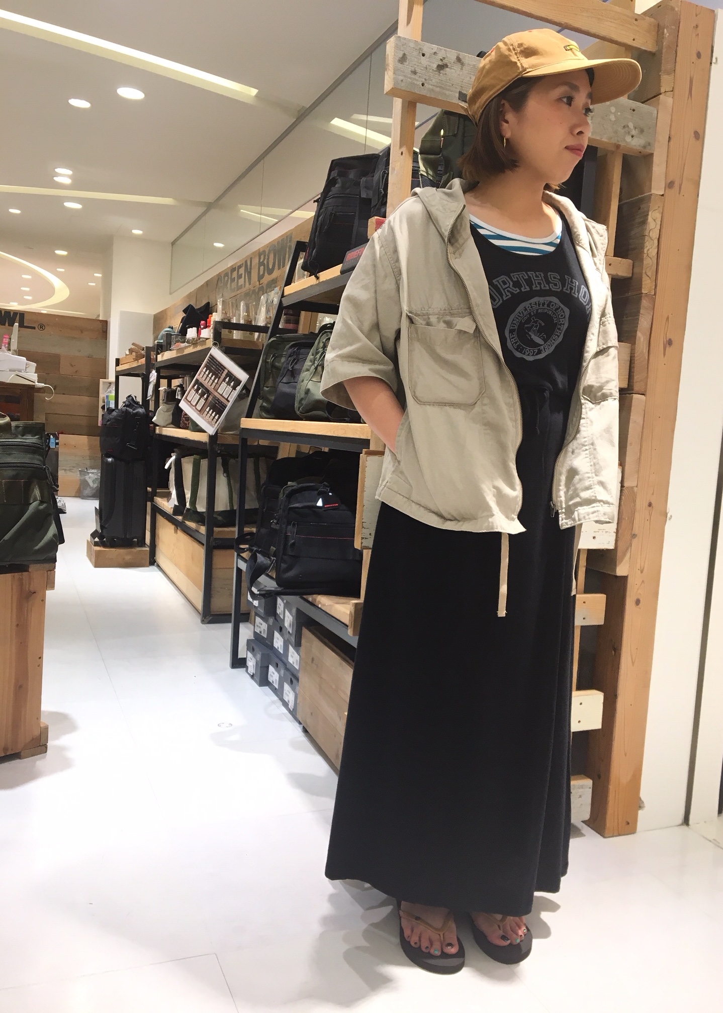 ワンピースでも使えるベースボールシャツをあえて羽織りで使用しました!