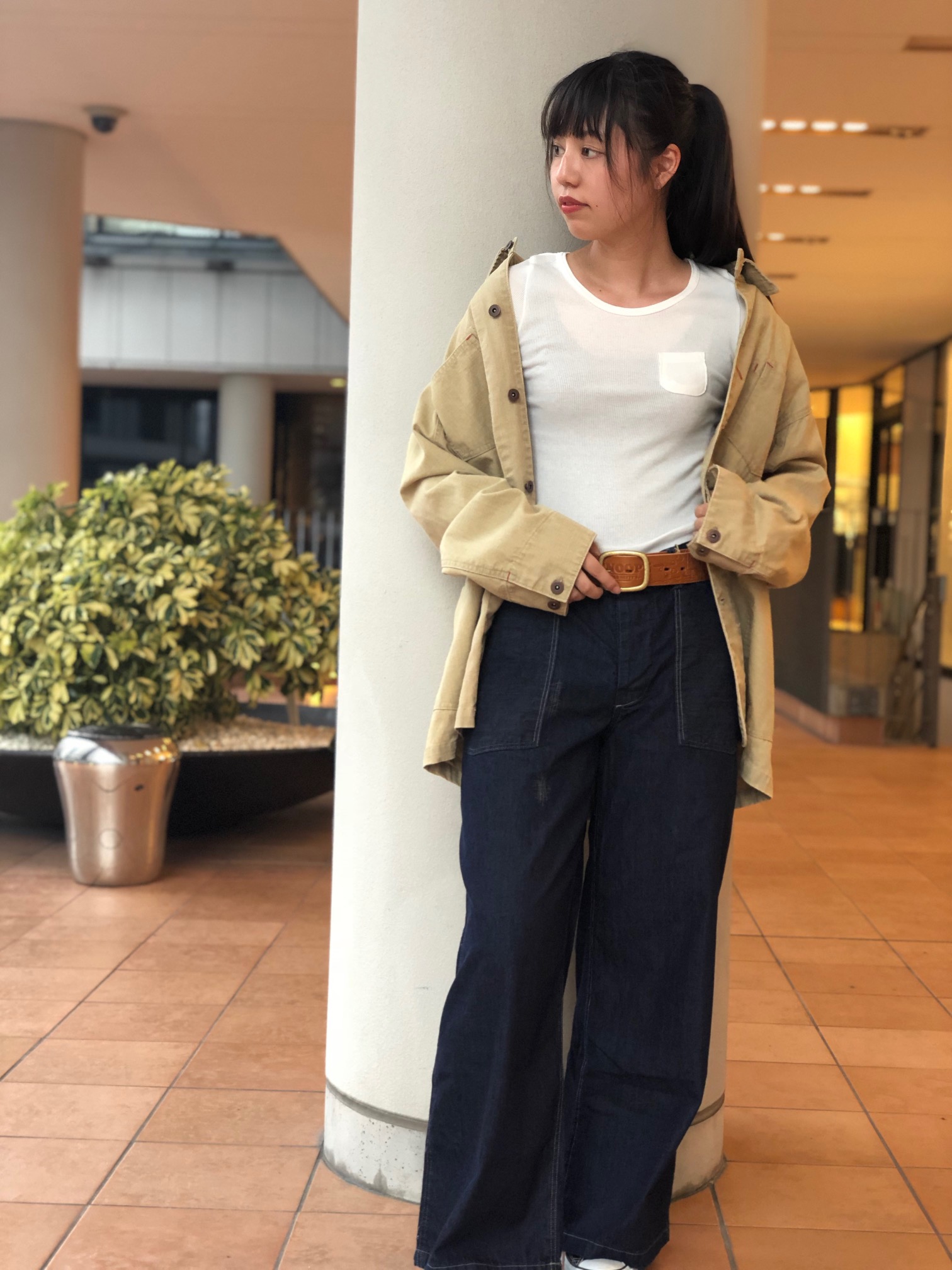 オーバーサイズのシャツをウエストでマークして