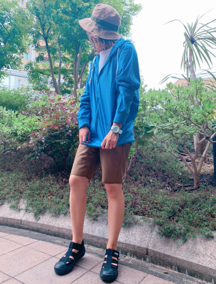 鮮やかな青のパーカーにベージュの短パンを合わせました!!