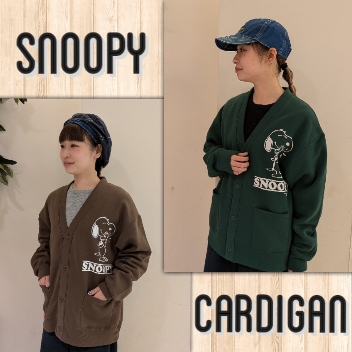 再入荷したスヌーピーカーディガンは軽くてとても扱いやすいアウターです。モデルが着用しているグリーンのカラーが人気☆